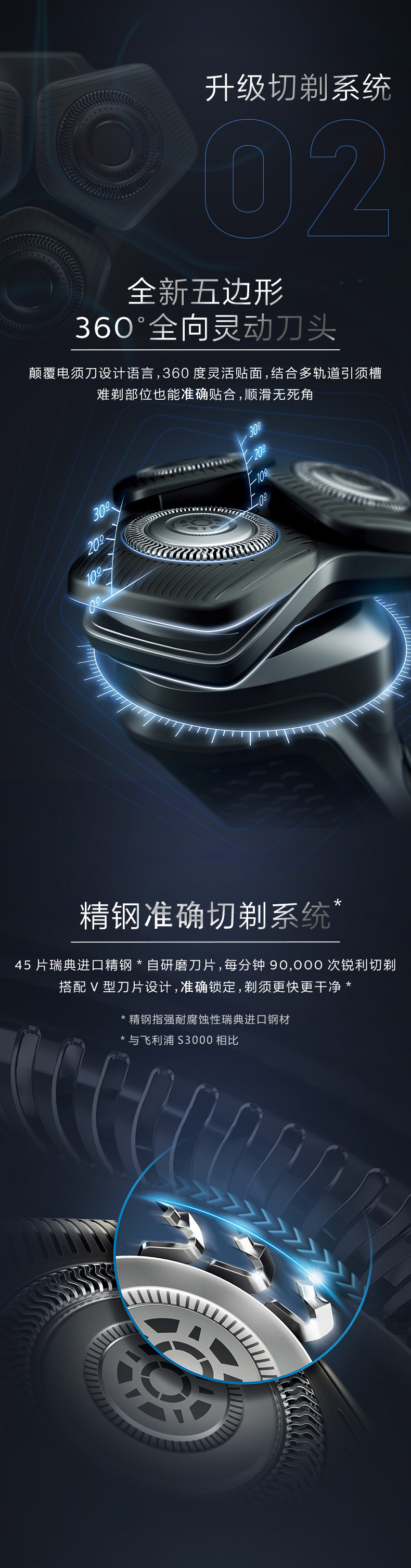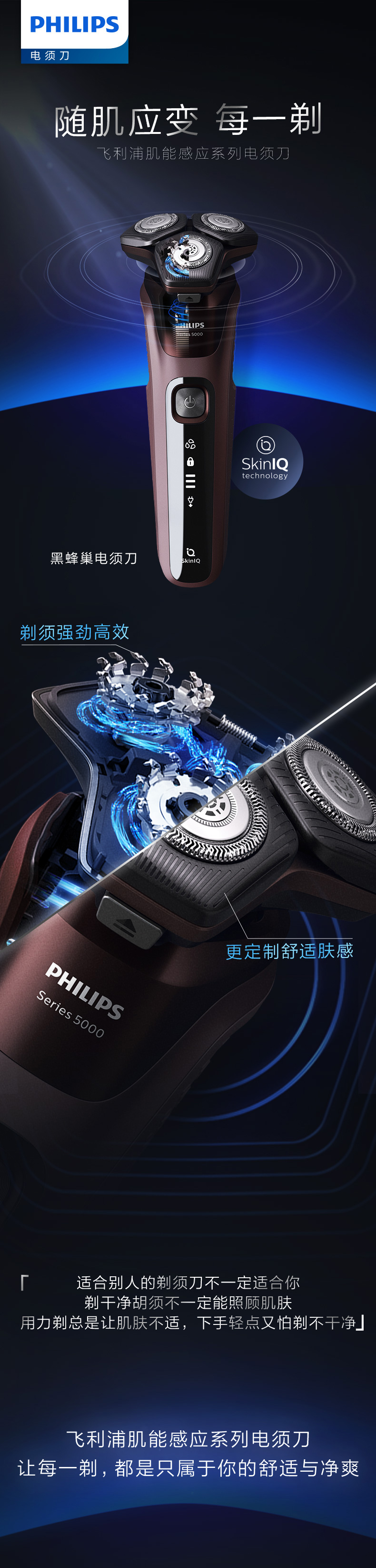 =689元 到手价,飞利浦 S5531 电动剃须刀是隶属于的5系新品,采用全新黑蜂巢概念,五边形360°全向灵动刀头,完全贴面,顺滑无死角。SkinIQ肌能感应科技,可以根据胡须和肌肤状态随肌应变,每秒125次,敏锐感知胡须状态,实时调整马达转数,更贴近肌肤,快速灵活舒适剃须。
