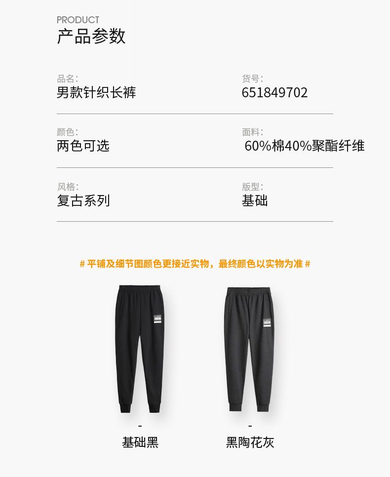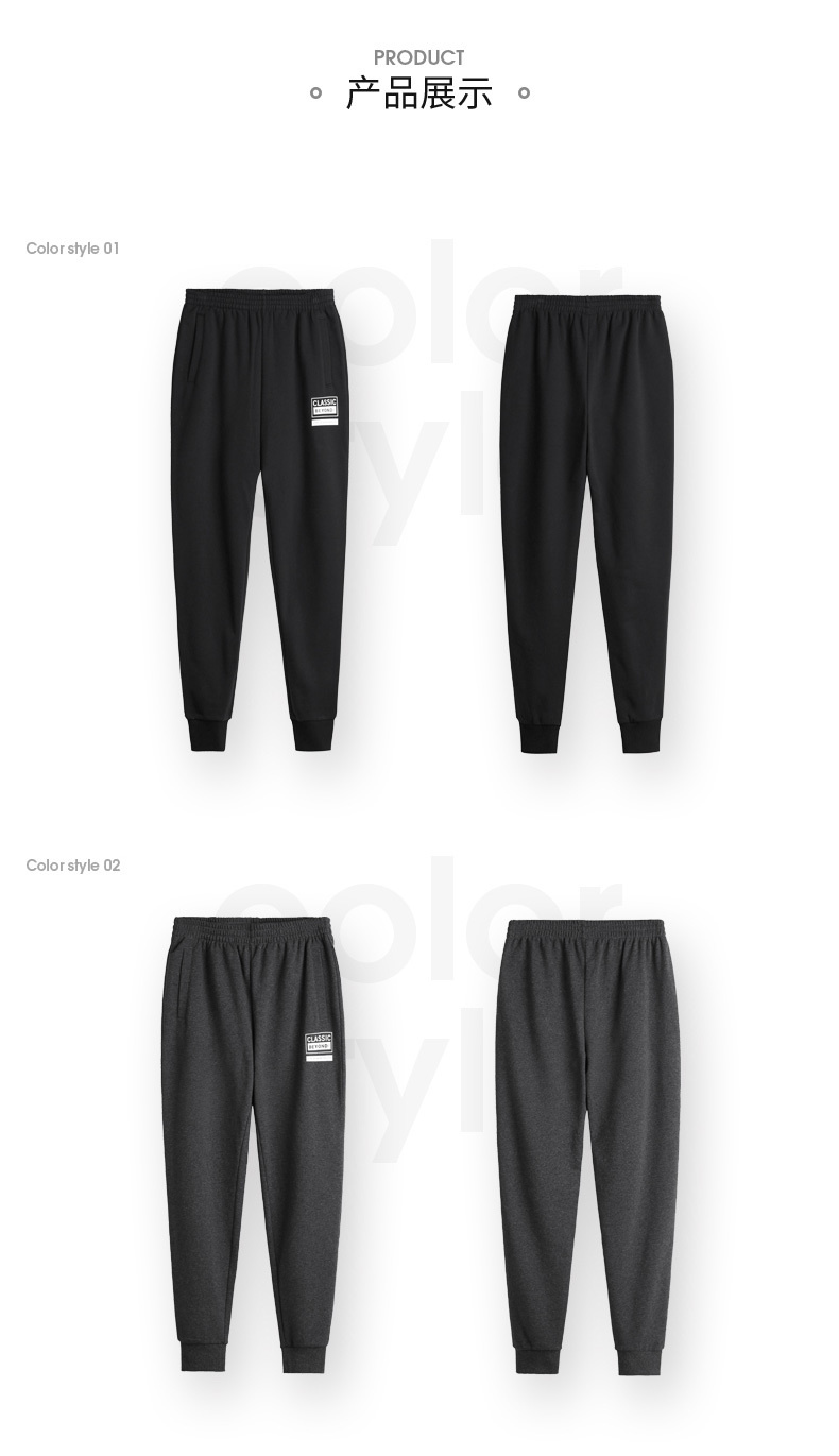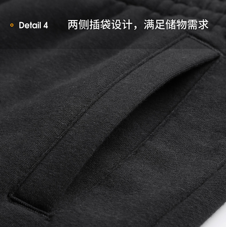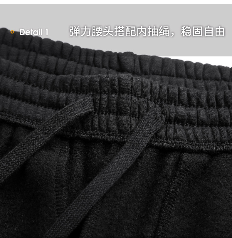 采用60%棉+40%聚酯纤维的混纺针织面料,内里是加绒的,适合秋冬季节穿。在款式上,休闲束脚裤,弹力腰头搭配内抽绳,穿脱方便。两侧有插袋,裤脚有罗纹。