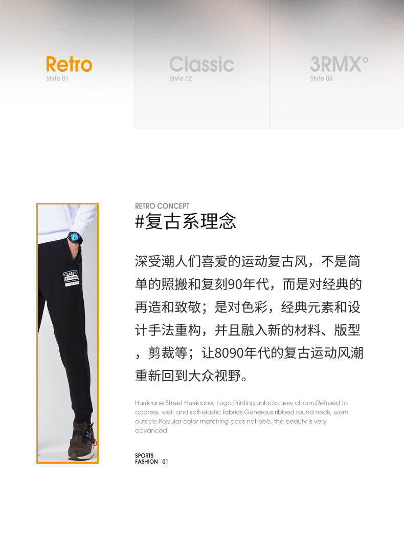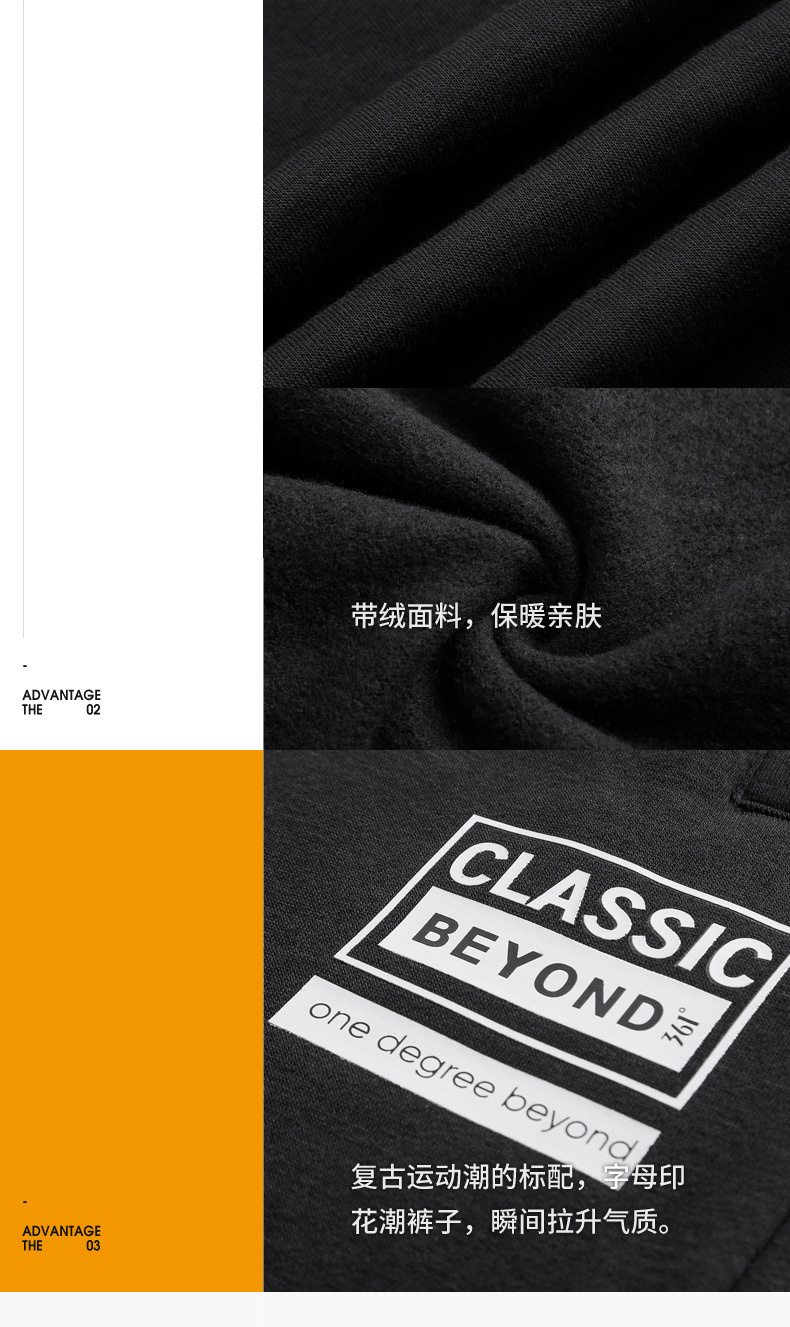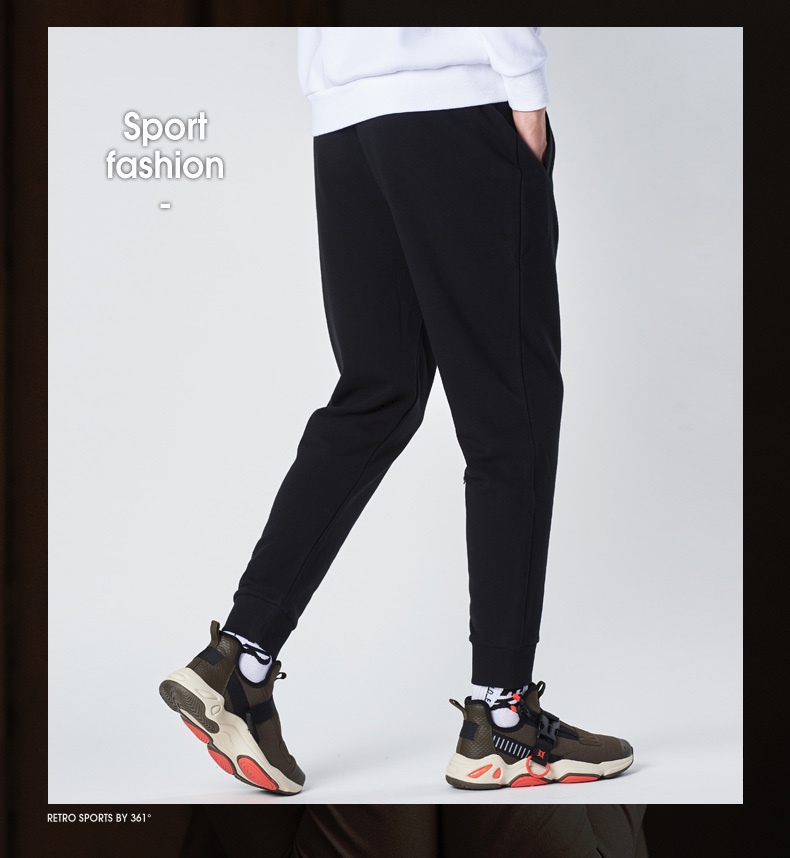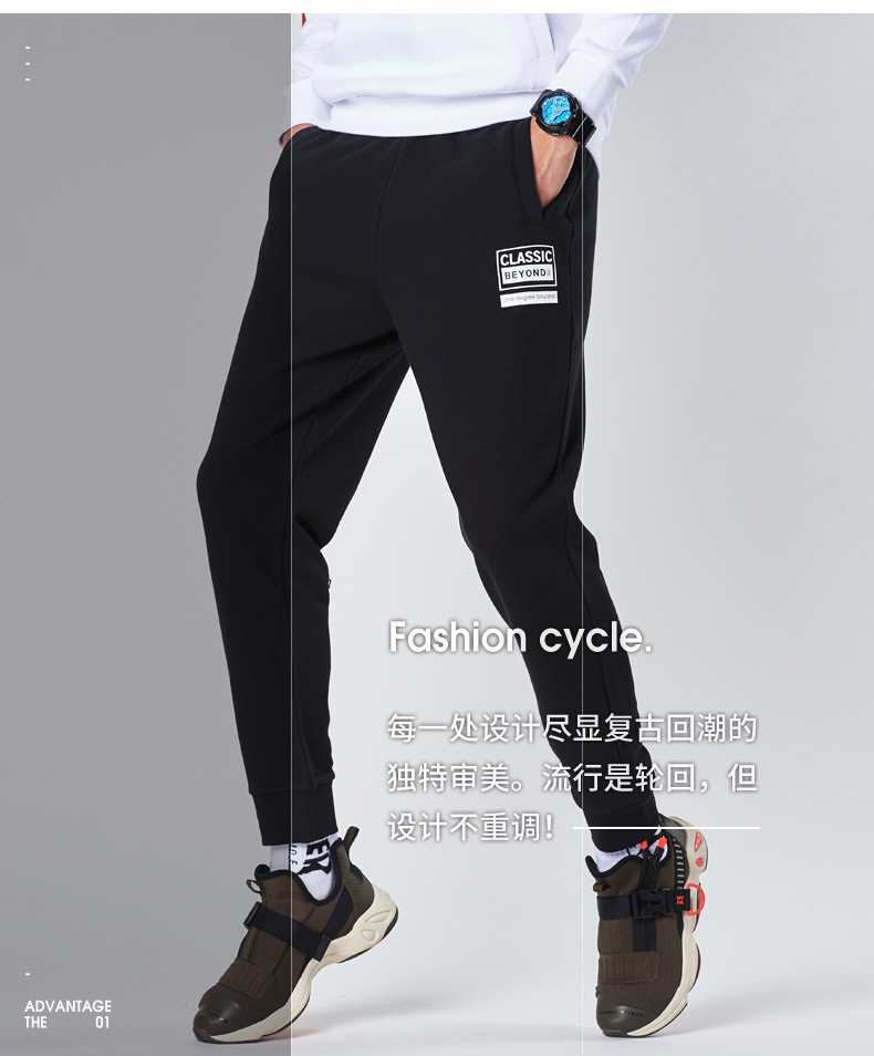 这款361度加厚针织加绒运动裤,2020秋冬新款,运动复古风,对色彩、经典元素和设计手法重构,并且融入新的材料、版型、剪裁等。
