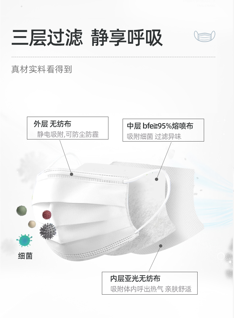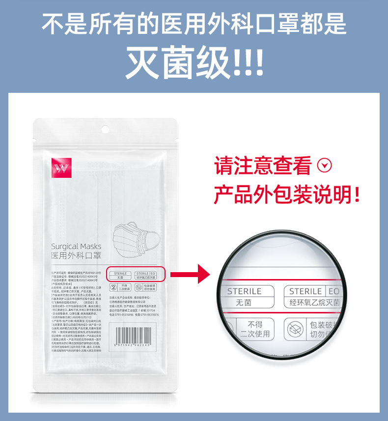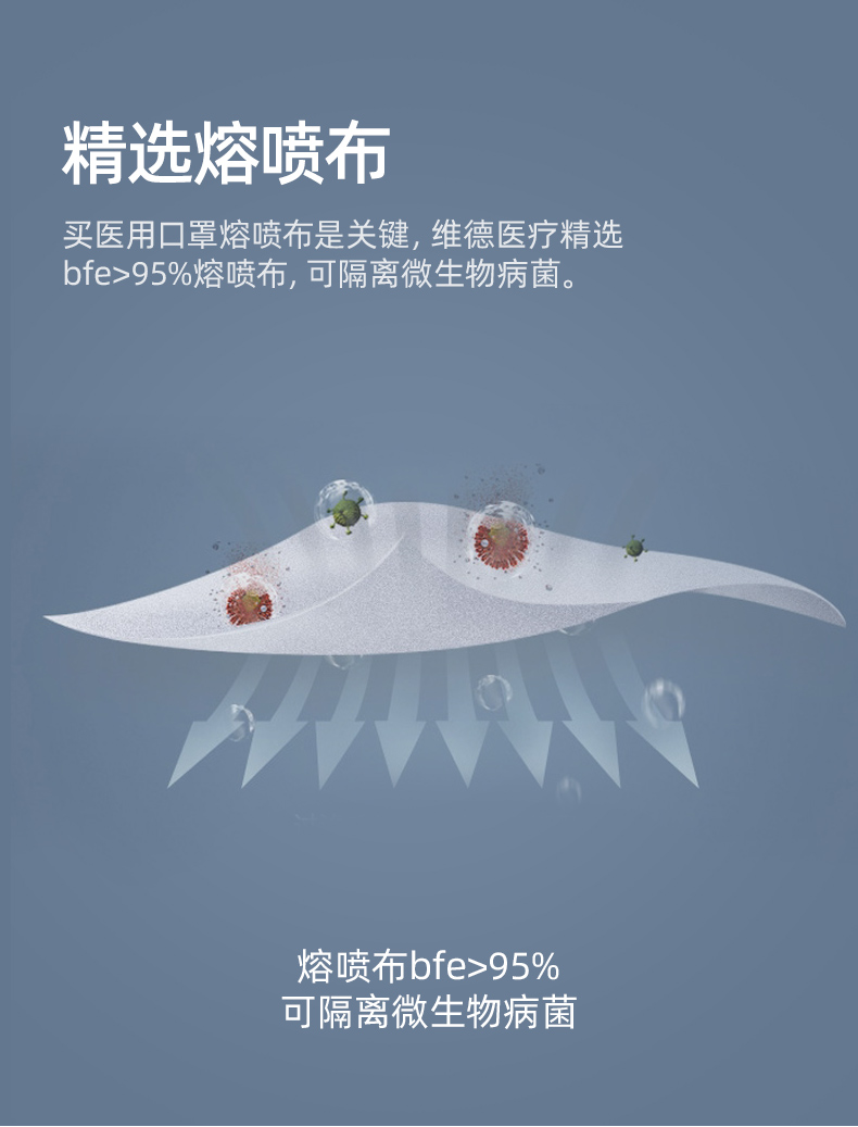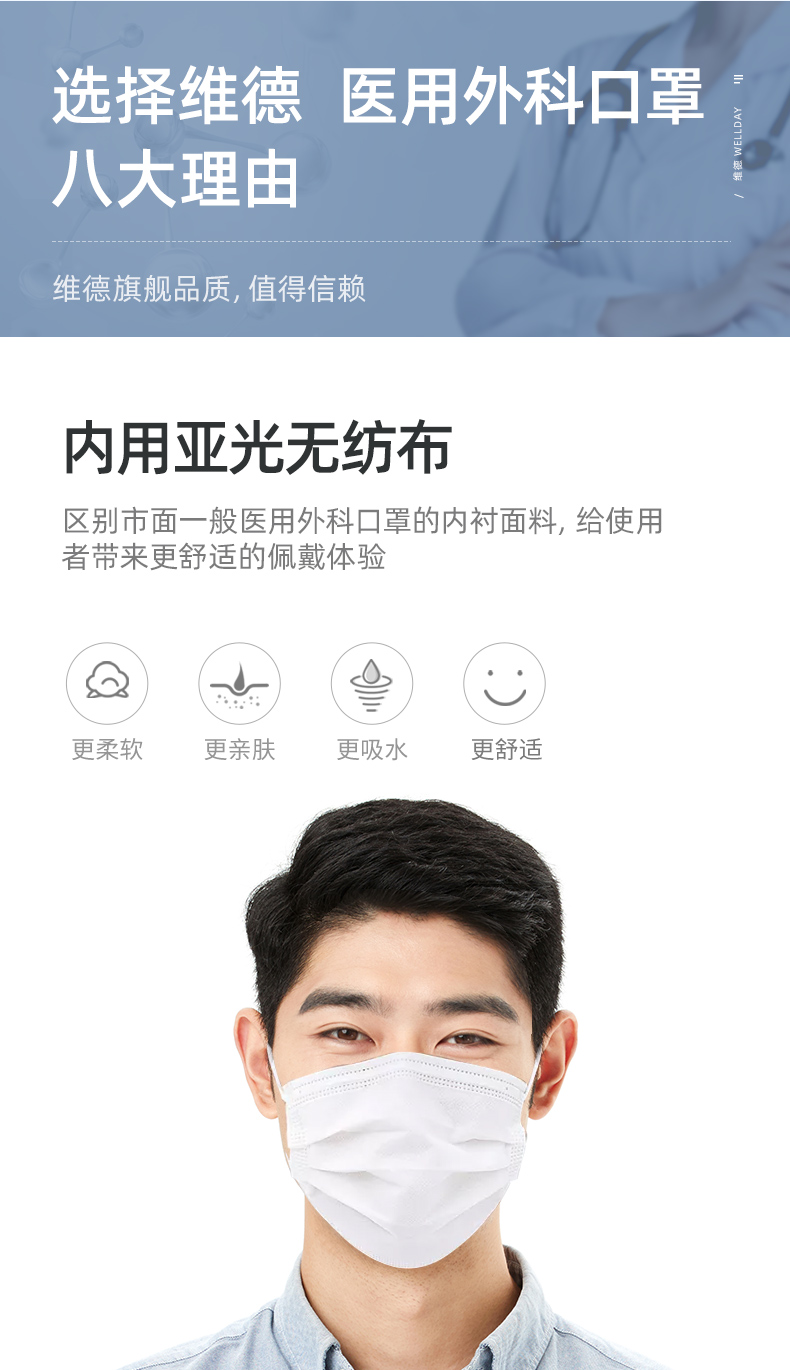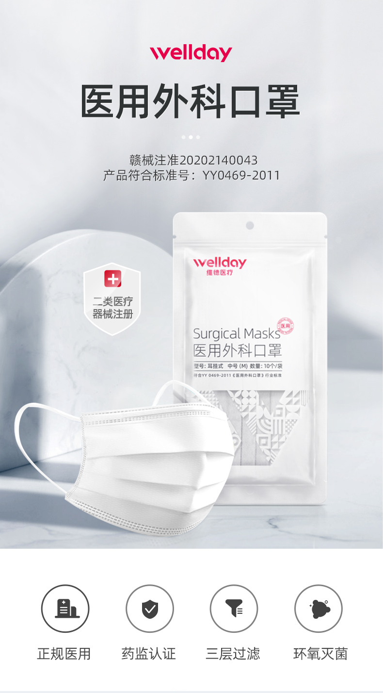 维德医疗 一次性医用外科口罩,执行标准号为YY0469-2011,二类医疗器械注册,经环氧乙烷灭菌,可进手术室级别,防止病原体微生物、液体、颗粒物等的直接投入,内外无纺布+熔喷布材质,细菌过滤率≥95%,对高压飞溅液体有防渗透作用。药监认证,医用品质。