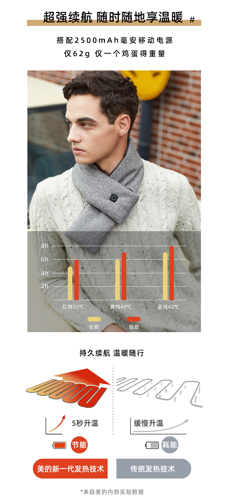 从颜值上来讲,也是目前为止最符合我审美的围巾,简洁不邋遢,短小精悍!电加热可水洗,符合我们追求方便的上班族习惯(就是懒)!内里填充杜邦棉,蓄热性能卓越,回弹性好,立体感强,恰到好处的环抱式设计,保暖周密。