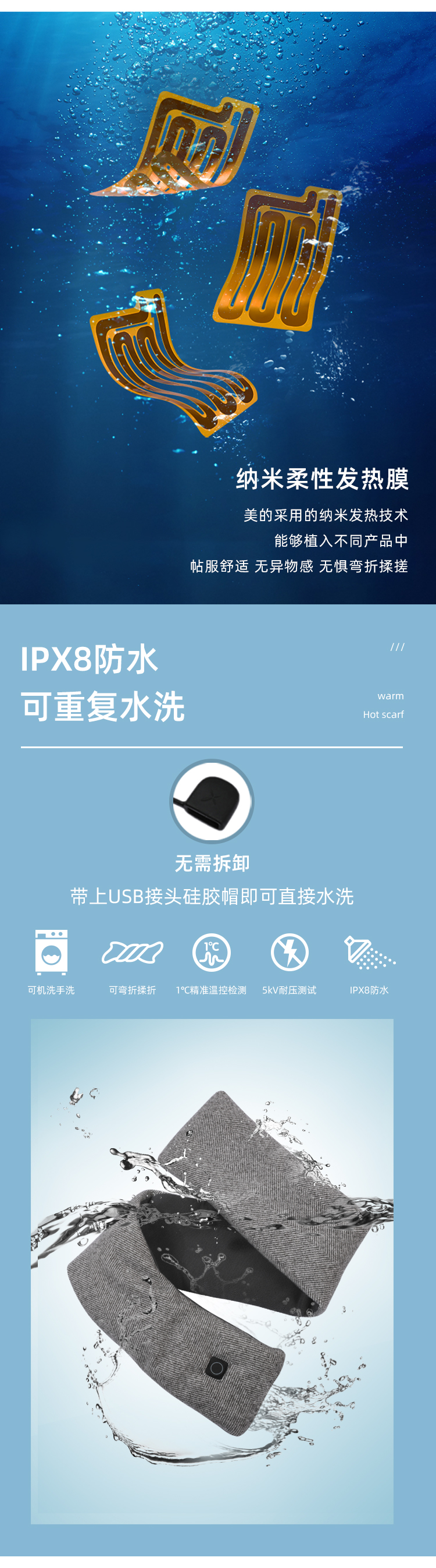 美的科技自发热围巾 热敷多档调节 温暖不论距离。发热围巾,除了保暖,还能起到颈椎保健的功效,时时刻刻热敷,缓解颈椎疲劳,冬季取暖神器!一键切换,3档温度可调,最高可达55度,可热水泡一个感受。