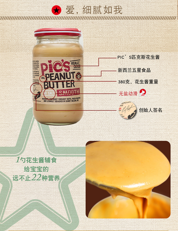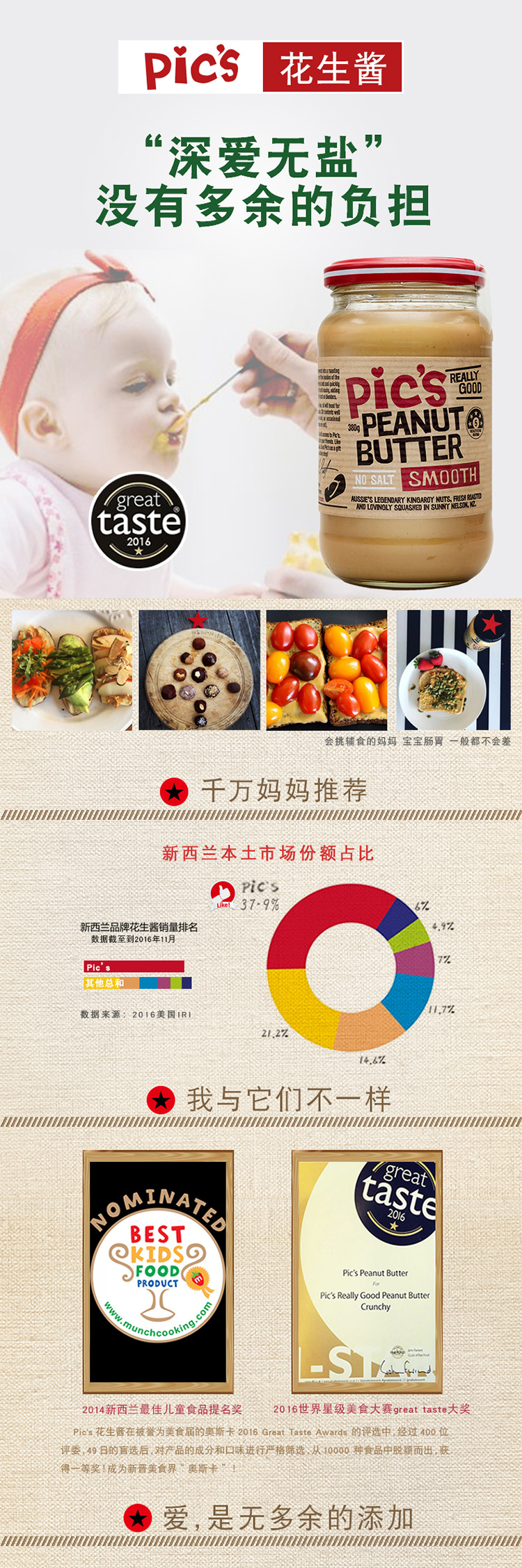 Pics的花生酱是新西兰国宝级的花生酱,也是全球最畅销的花生酱,在2014年新西兰最佳儿童食品提名奖1、2016年获得了世界星级美食大赛GREAT TASTE大奖,这个奖项堪称食品界的“奥斯卡”,含金量无可争议。