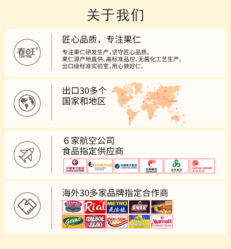“春旺”是临沂富春食品有限公司旗下品牌,成立于2001年12月,是一个专业生产咸味花生及其他果仁制品的休闲果仁食品企业, 是美国绅士坚果、麦德龙..指定供应商,同时也是中国东方航空,山东航空公司,中国南方航空等6家航空公司食品指定供应商,产品远销全球30多个国家,深受广大经销商和消费者的喜爱。