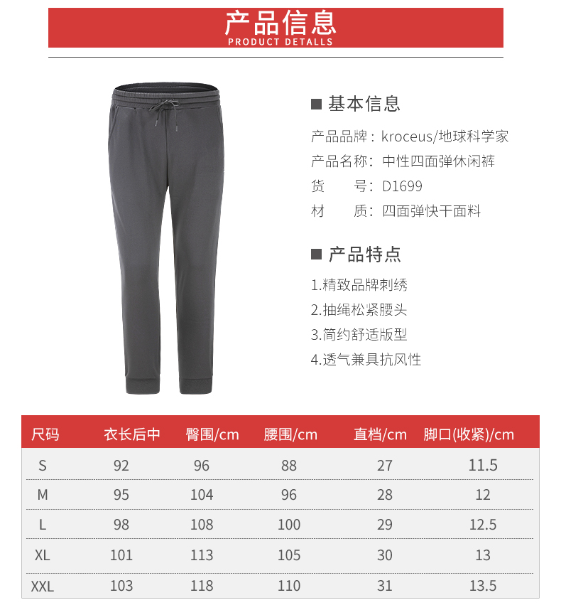 这款地球科学家男士运动裤是2019款,运动裤款式,使用是加厚速干面料,内里有一层薄抓绒,正适合春秋季穿,能抗10度左右。松紧+抽绳的弹力裤腰,穿脱方便。罗纹收缩裤脚,贴合腿部不灌风。