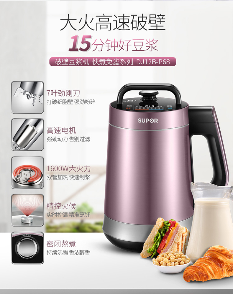 =199元 到手价,同款京东299元,这款是苏泊尔商超同款的破壁豆浆机,从1万转速升级到了2万转速,刀头升级为了7叶刀头,加热功率高达1600W,快速制浆功能只需要15分钟就能喝到热乎乎的豆浆,而且苏泊尔是大品牌,全国联保,产品质量有保障。