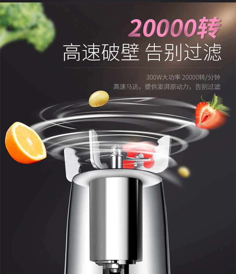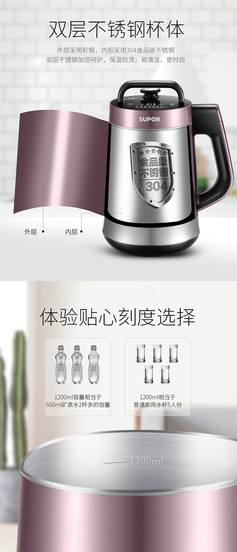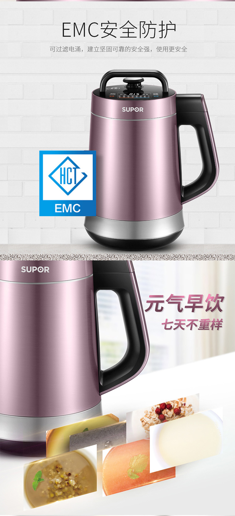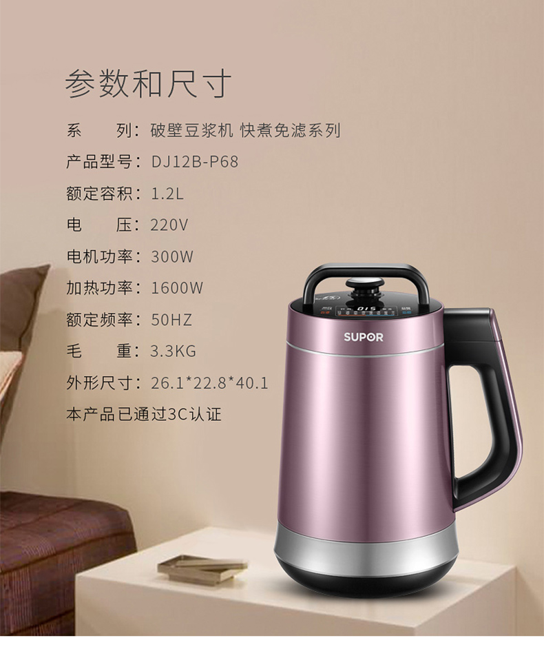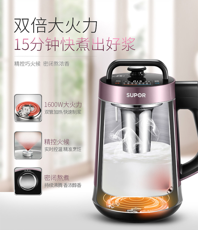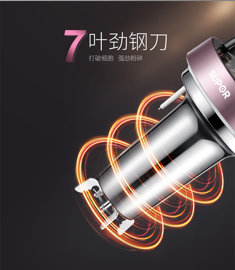 这款苏泊尔豆浆机采用全新的破壁免滤4.0技术,用20000转/分的C8高速破壁电机配合30孔超微扰流研磨器和7叶双面精钢波浪刀片,使得豆浆在小空间内完成精细磨研磨的过程,最后是大吸力的精磨器,不停的吸取研磨,轻松实现免过滤的效果。