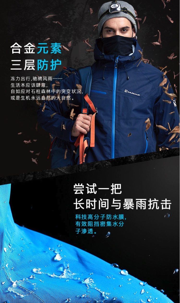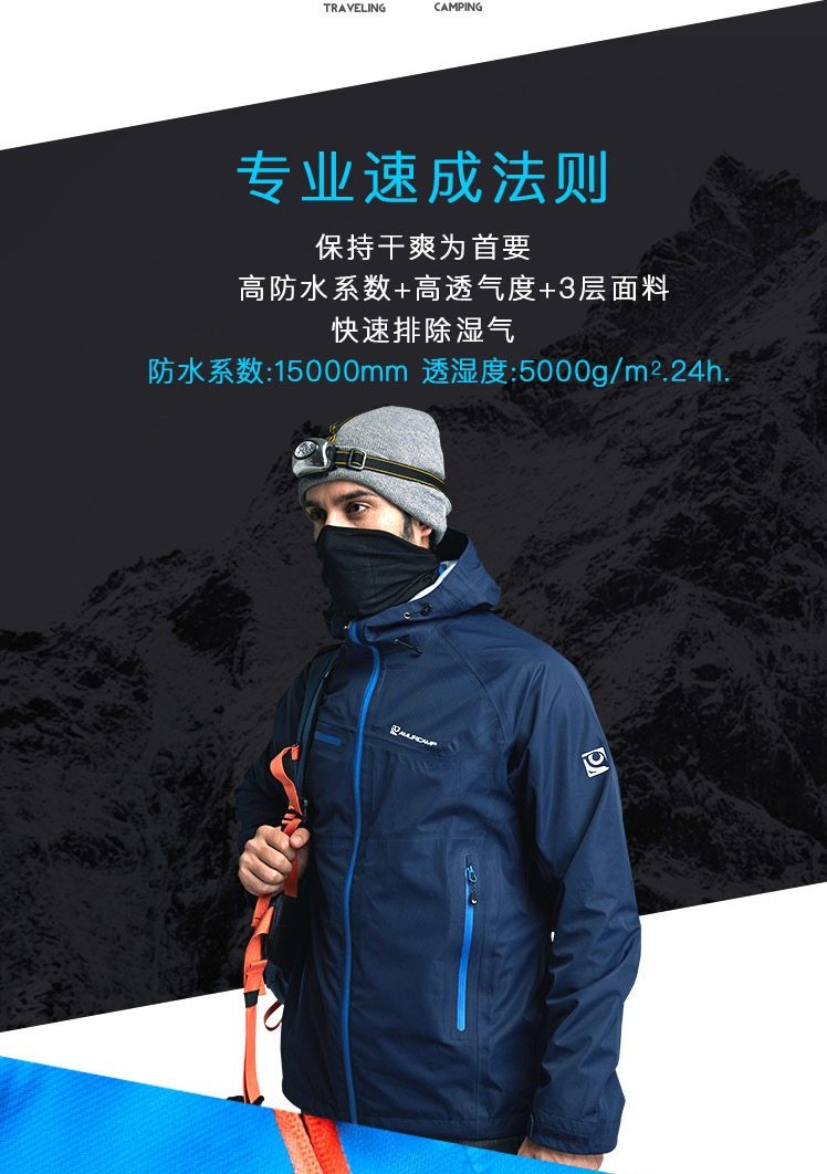 Amurcamp合金元素系列拥有15000mm防水指数,和5000g的透气指数,高强度抗撕裂面料,所有缝线位置都经过热封压胶处理,不会从针孔渗水。主拉链和侧边口袋拉链都是防水的。作为对比,国内品牌的冲锋衣多是5000mm水压和3000g透气,因为国标的要求就是5000mm水压,多数时候防水就够了。