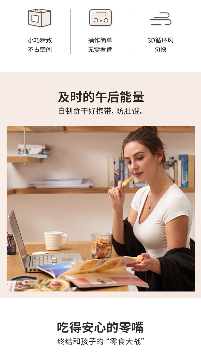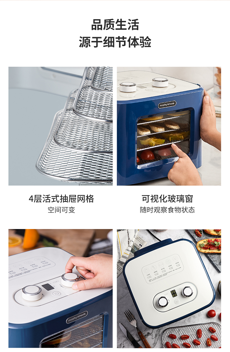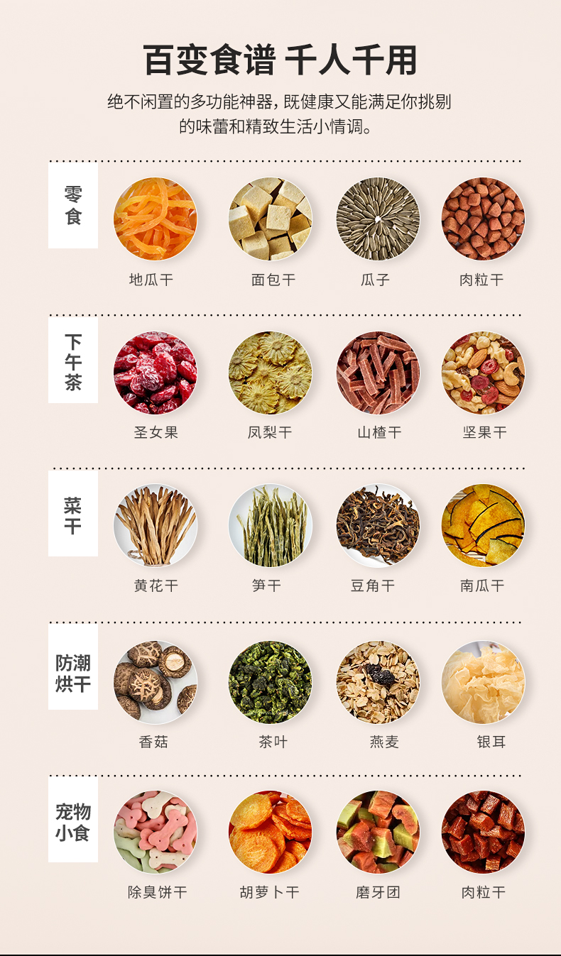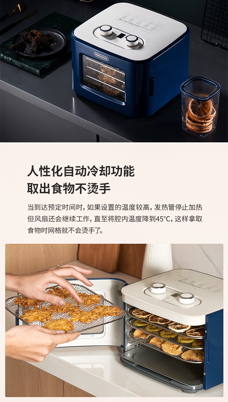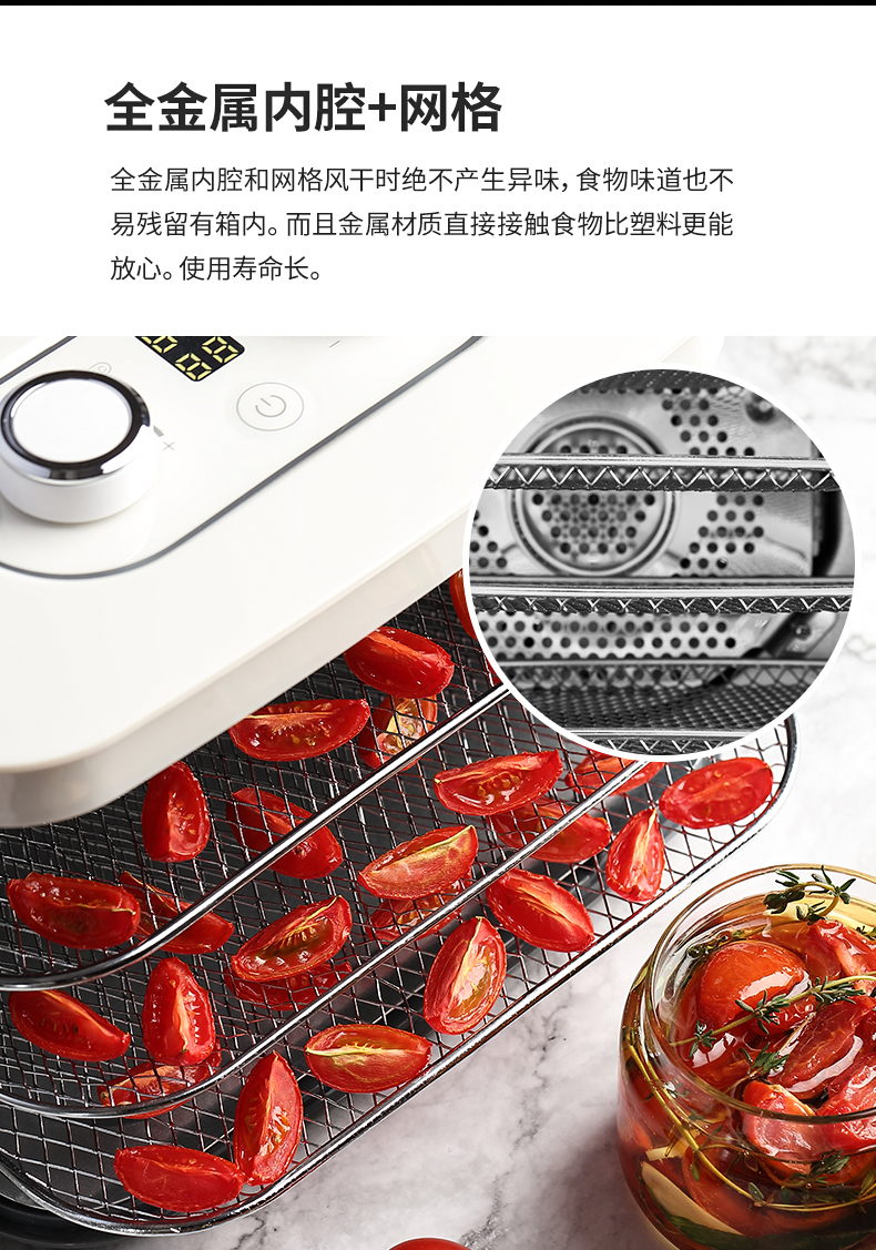 采用3D沿弧背部风道+电子温感,高效风感,热力更加均匀。全金属内腔+网格,不产生异味,使用寿命更长,4层活式抽屉网格,可视化玻璃窗,旋钮调节。自制干果零食,远离添加剂,远离不健康食品。