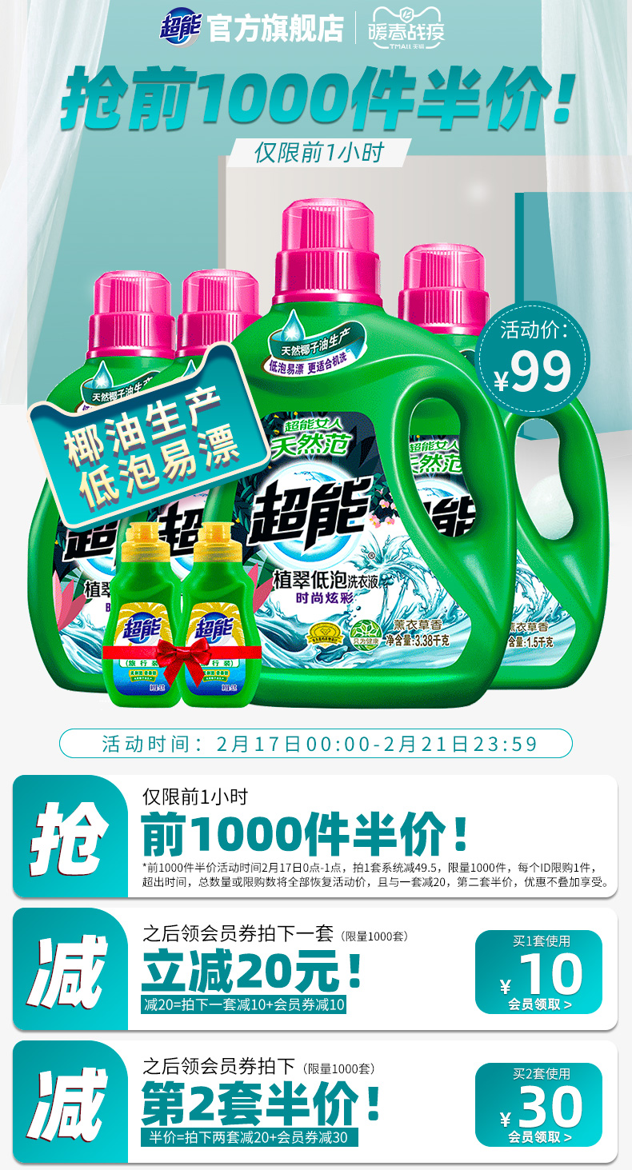 天猫超能官方旗舰店0元,可领20元优惠券,实付79元到手,是正价259元的3.1折;6瓶近13斤装。可用一年,还可凑津贴做到更低。超值组合装,内含3.38kg大瓶、1.5kg瓶装、750g*2瓶、80g手洗旅行装*2。超能大品牌,孙俪代言。经典薰衣草香,家用足足一年的量,天然椰子油质造,不伤衣服不伤肤,低泡天然,洁净更清香!领券链接点此