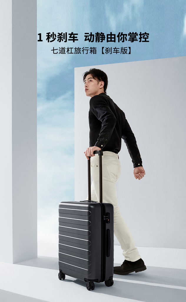 这款小米生态链 90分 带刹车PC耐磨拉杆箱,20英寸 货号:1056,刹车键设置在拉杆槽内,即美观又使用方便,按钮向右即启动刹车,向左即恢复行进,经反复测试,使用简单有效。采用德国科思创PC材质(原 德国拜耳),将防刮层、增韧层、辅助层,三层PC同步热压,一体成型,赋予箱体超韧耐磨的力量,色泽细腻,久用如新。采用HINOMOTO日乃本万向轮,双轮结构,外层TPE材质,旋转灵活,减震耐磨,出行几乎无噪音,长久顺滑。U型整洁收纳袋设计,-侧网格可视,查找便捷,一侧不透明收纳袋,方便存放隐私物品,上层拉链袋笔记本电脑,满足差旅出行需求。