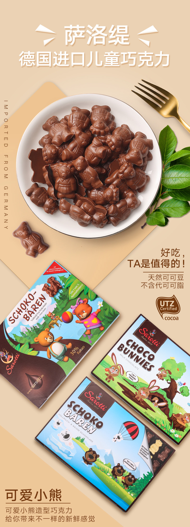 这款萨洛缇Sarotti儿童小熊牛奶巧克力,德国原装进口,保证品质,独特卡通小熊造型,每盒36个,一口一个,入口即化,内里有密封薄膜,不易损坏;含30%的可可含量,不伤健康,封盖背面是卡通熊的绘画板,给孩子一个惊喜。
