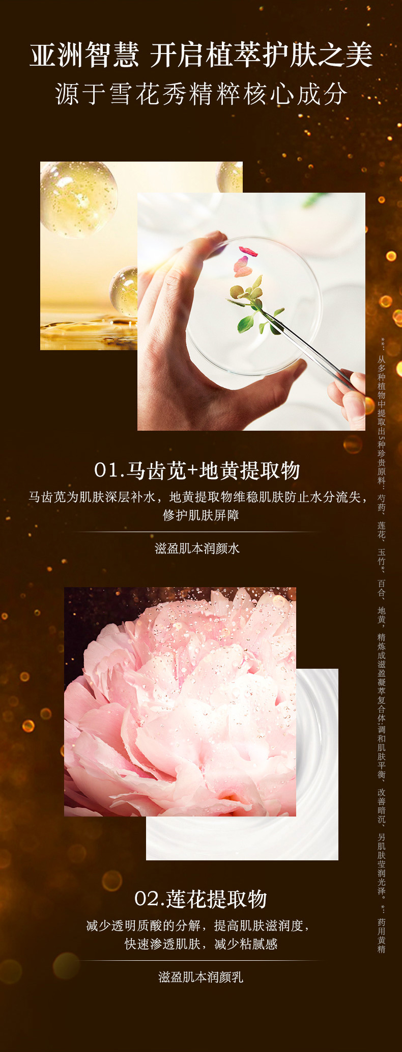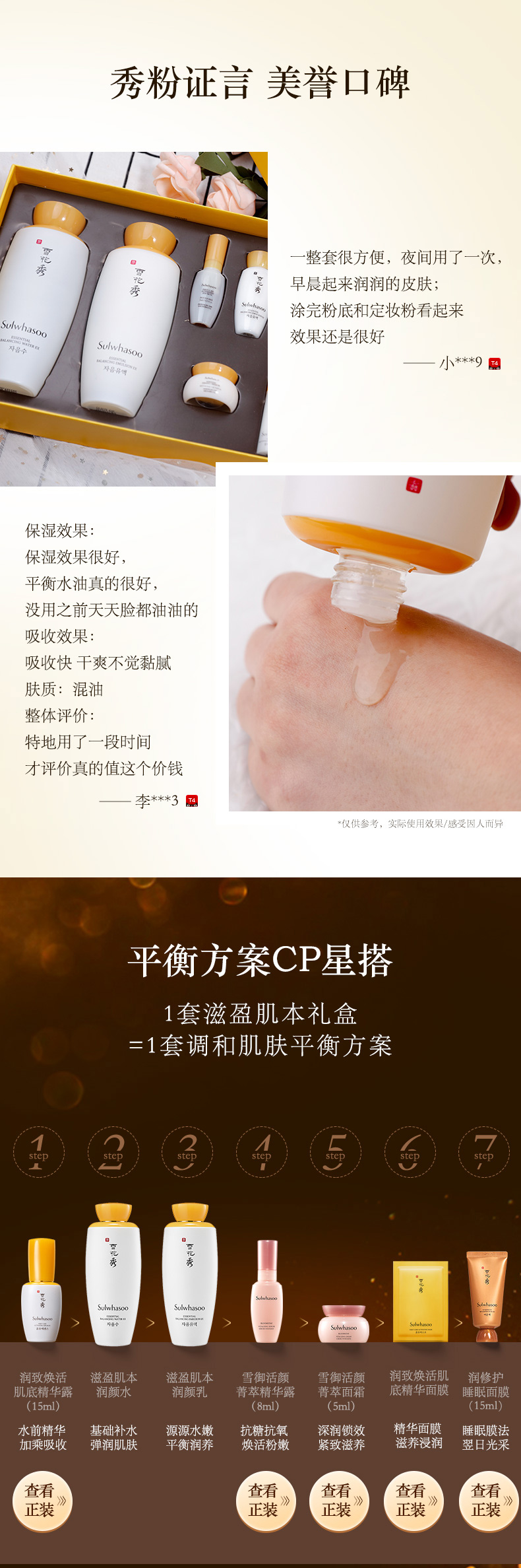 这款雪花秀 乳套装,通过滋阴丹从根本治理因阴气不足而导致的老化现象,由内而外帮助改善肌肤老化,平衡水含马齿苋萃取物供给肌肤水分,缔造饱满水润肌肤,平衡乳含牡丹提取物让肌肤柔滑。早晚使用平衡水后取适量于手中,沿着皮肤纹理轻涂于面部。