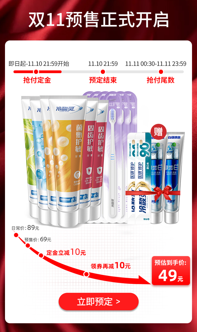 天猫冷酸灵旗舰店,¥69元 双11预售价,-10元 付定金立减,-20元优惠券,=39元 到手价(定金10+尾款29),包含三支牙膏180g+三支120g+六支牙刷,付定金加赠极地白30ml*2+2瓶漱口水,冷酸灵双重抗敏感牙膏新款组合,深层洁净,健白牙齿,护敏新体验,一套多效解决多重问题。