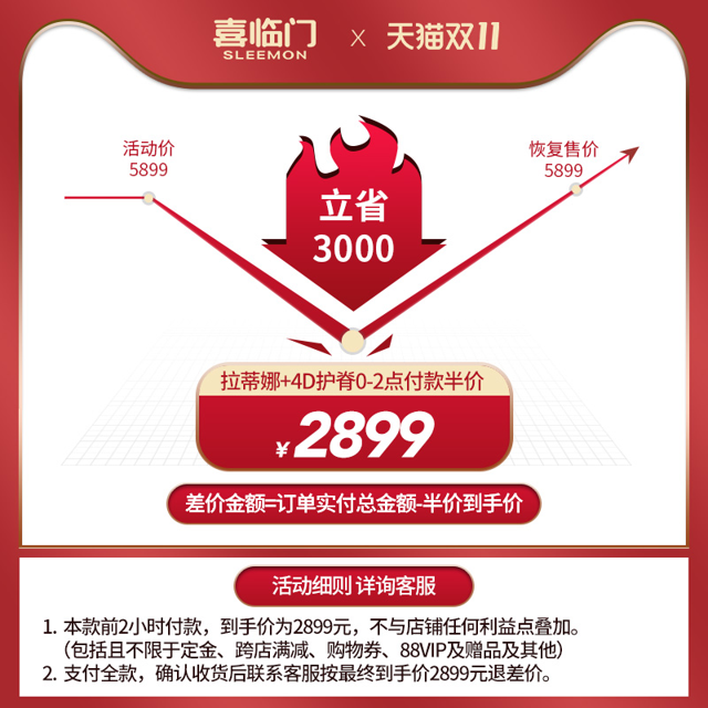 天猫喜临门官方旗舰店目前预告,此款11日0点开始,前2小时下单可得2899元到手,组合套装低价可入。