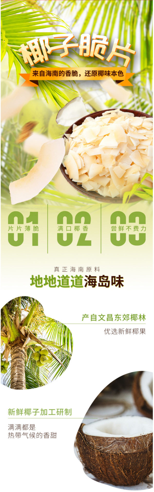 这款春光 烘烤椰子脆片,优选产自文昌东郊椰林的新鲜椰果为原料,经过适度烘烤而成,呈现短条状,色泽黄白自然,椰香四溢,轻薄香脆,入口片片嘎嘣脆,规格是60g*3袋。