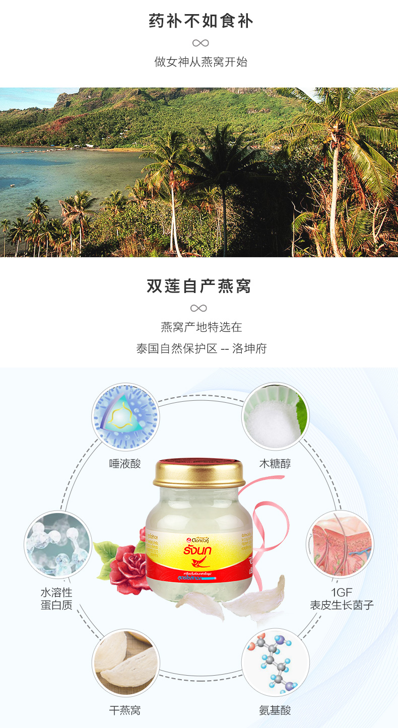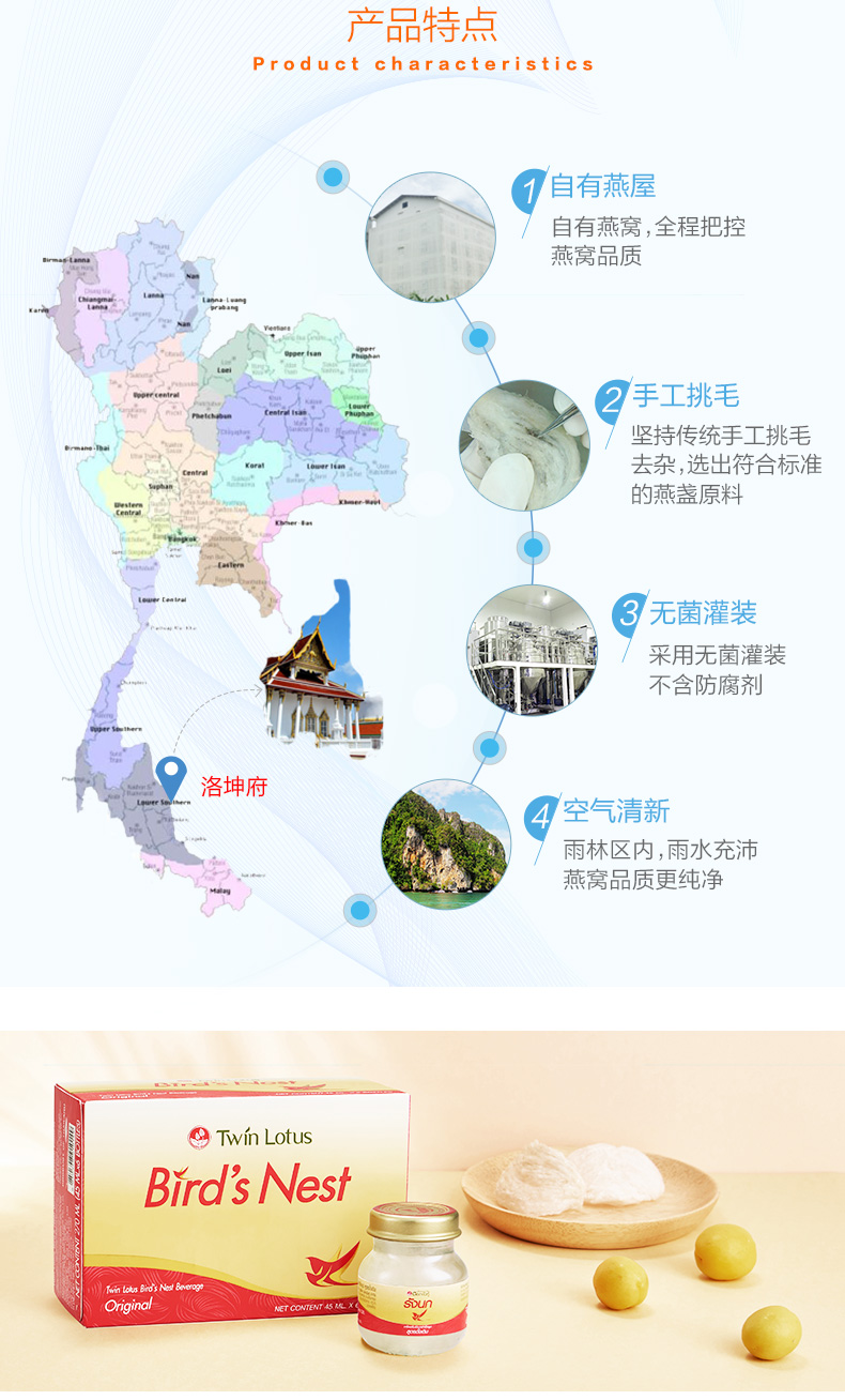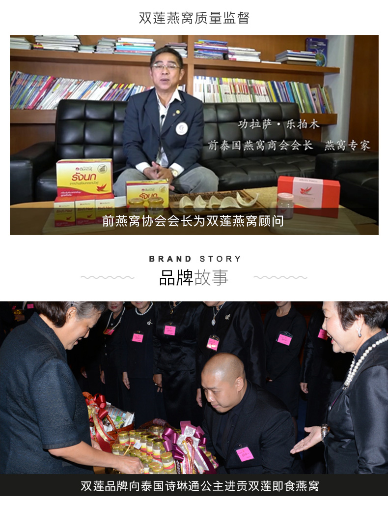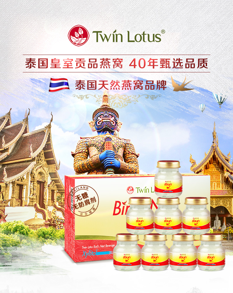 双莲TwinLotus是泰国是正经的老牌燕窝品牌,产自泰国大自然保护区洛坤府,品质全程掌控。前泰国燕窝商会会长、燕窝专家功拉萨·乐拍木的极力称赞,并成为进贡泰国皇室的滋养佳品。