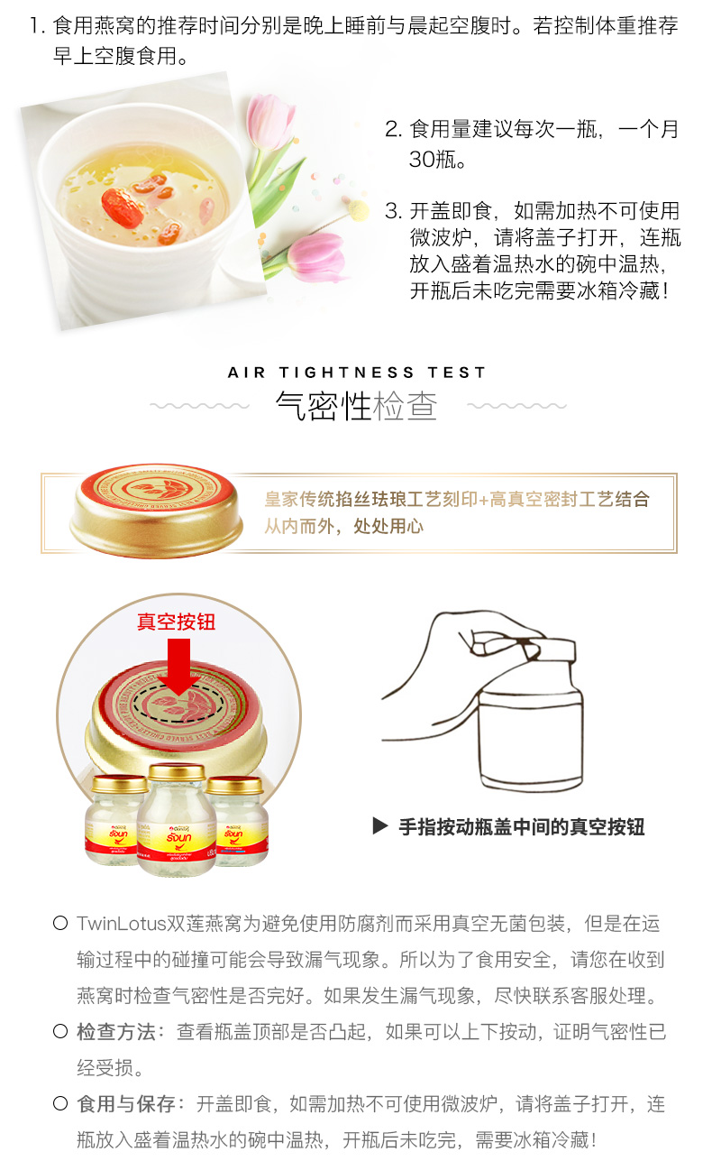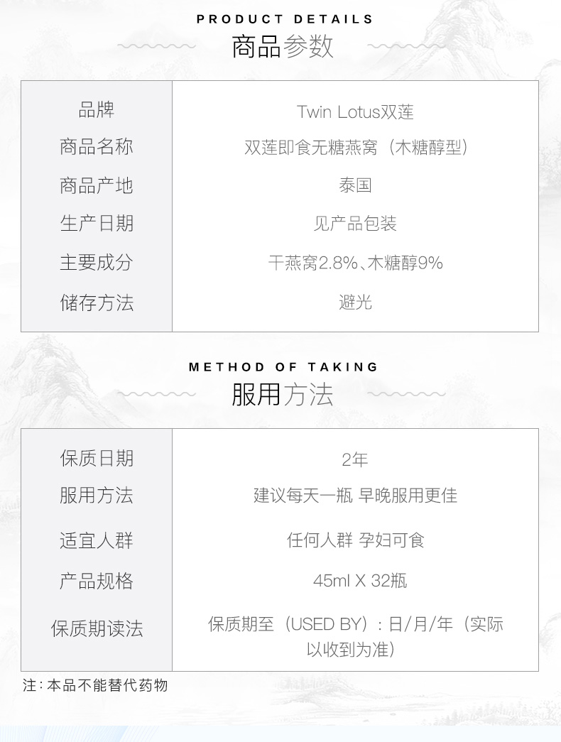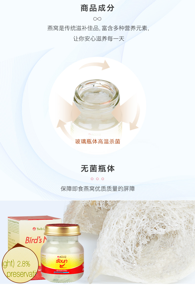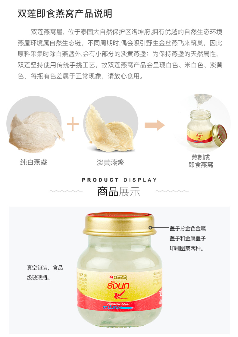 双莲TwinLotus是泰国是正经的老牌燕窝品牌,产自泰国大自然保护区洛坤府,品质全程掌控。前泰国燕窝商会会长、燕窝专家功拉萨·乐拍木的极力称赞,并成为进贡泰国皇室的滋养佳品。