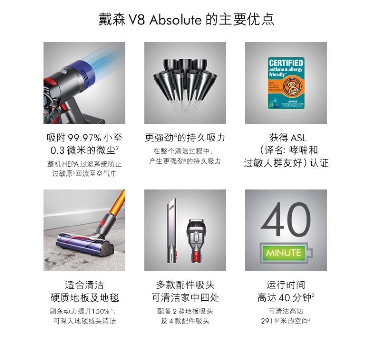 首先是主机,采用戴森第八代数码马达,比起V6的第六代马达,吸力更为强劲。清洁范围不仅限于光滑地板,在地毯/缝隙/床褥方面也有不错表现。比起V6,V8采用了6个无衰减锂离子电池供电,运行时间提升至40分钟,机身带有电量指示灯。