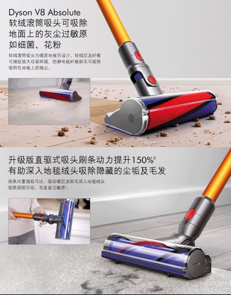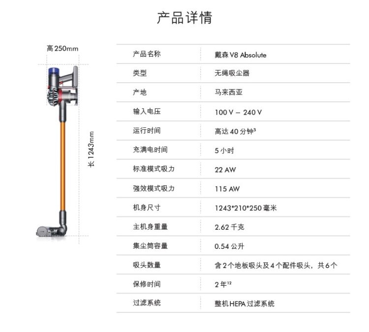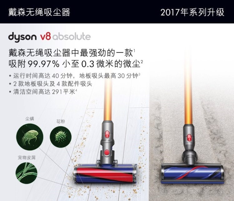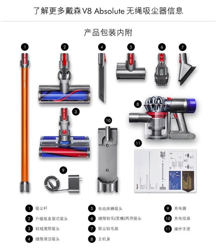 由于戴森新款V10的上市,老款目前纷纷打折,全都是入手好价。其实买戴森吸尘器,主要看主机配置,其次是看带的吸头型号。今天推荐的这款戴森Dyson V8 Absolute 真空无线吸尘器,是17年出的款,是此前的旗舰款。