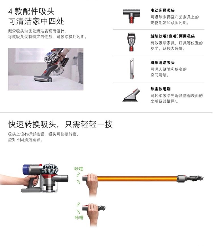 如果想搞明白戴森各吸尘器的差别,需要把吸尘器的“机身”,与“吸头”分别看。戴森吸尘器很贵,但实际上吸尘器本身价值约150美元,而戴森吸尘器的主力吸头,单个就要100美元,戴森各款吸尘器,实际上就是吸尘器的“机身”搭配不同种类的吸头,适合不同环境使用,产生的价格差异。