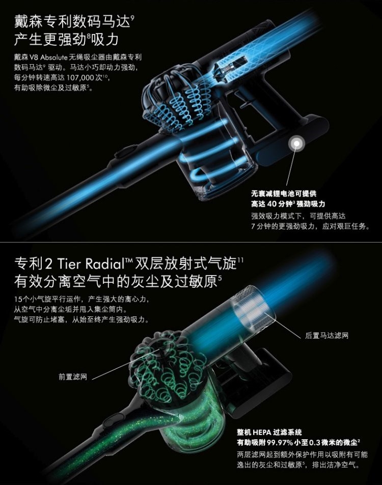 原有的Tier Radial 放射式气旋结构,结合整机HEPA过滤系统,能够吸附99.9%小至0.3微米的颗粒物,带上后置的马达滤网,使V8排出的空气更为洁净。全新的集尘筒清空设计也是亮点,新的清空集尘筒设计只需上拉红色按钮,就能一步清空尘垢和碎屑,无需接触尘垢。噪音方面,比起上代减少一半。