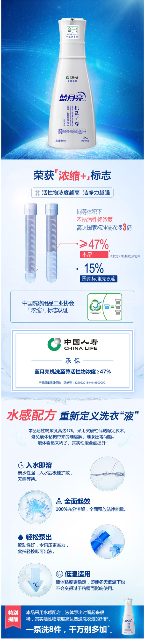 机洗至尊活性浓度高达47%,采用突破性低粘稳定技术,避免液体粘稠带来的难溶度、难泵出等问题。亲水性强,入水后急速扩散,入水即溶,100%全面起效,全面释放洁净能量;突破性高效洁净因子和活性物,深层去渍去污,防止再附着。