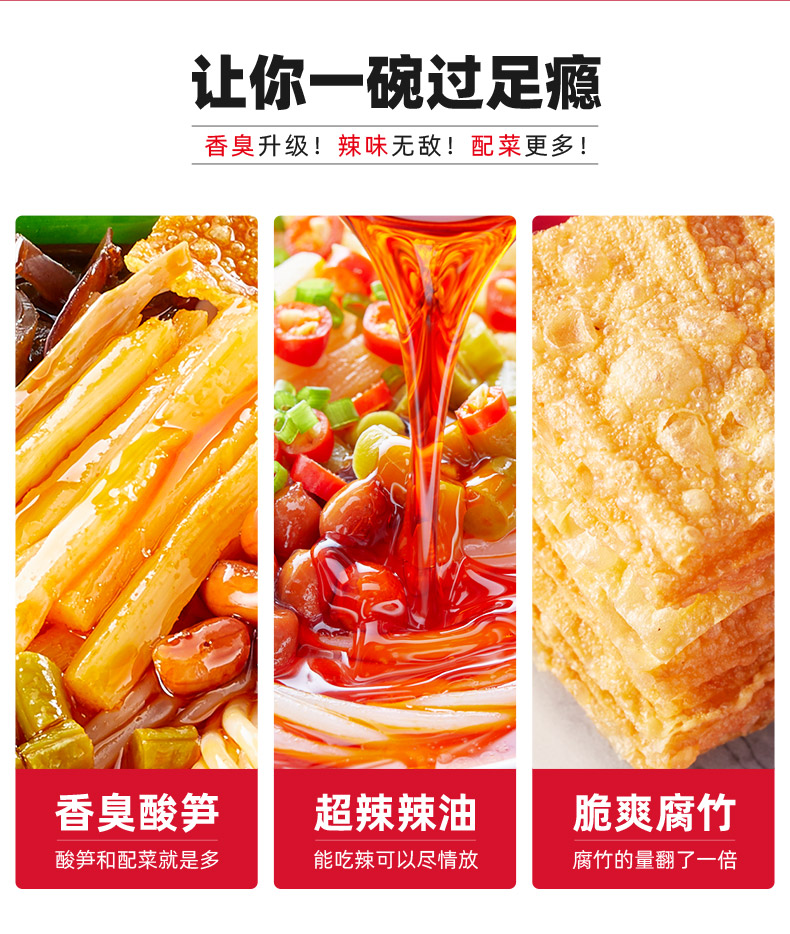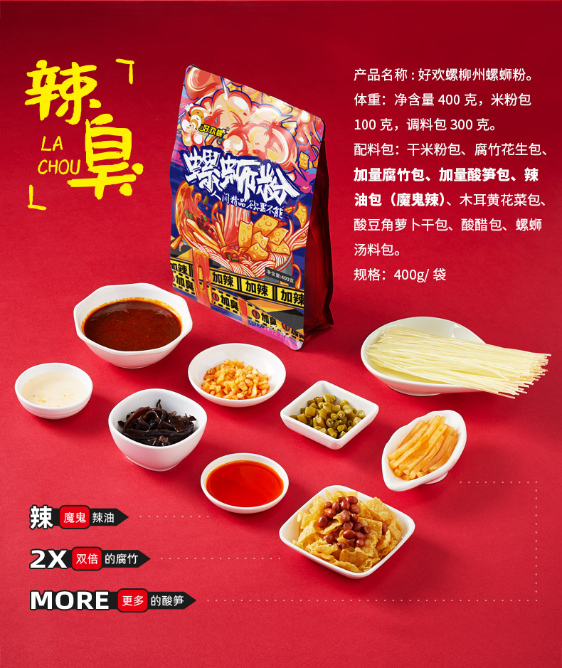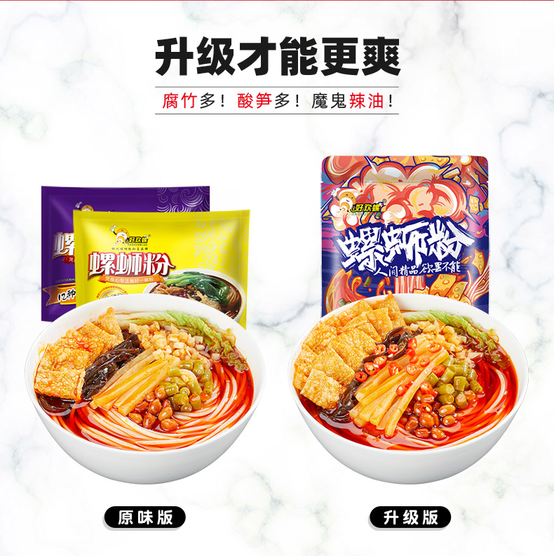 这款好欢螺螺蛳粉是升级版,较平常版本多了100g,单袋加了1元左右,加量腐竹、加量酸笋、加辣。