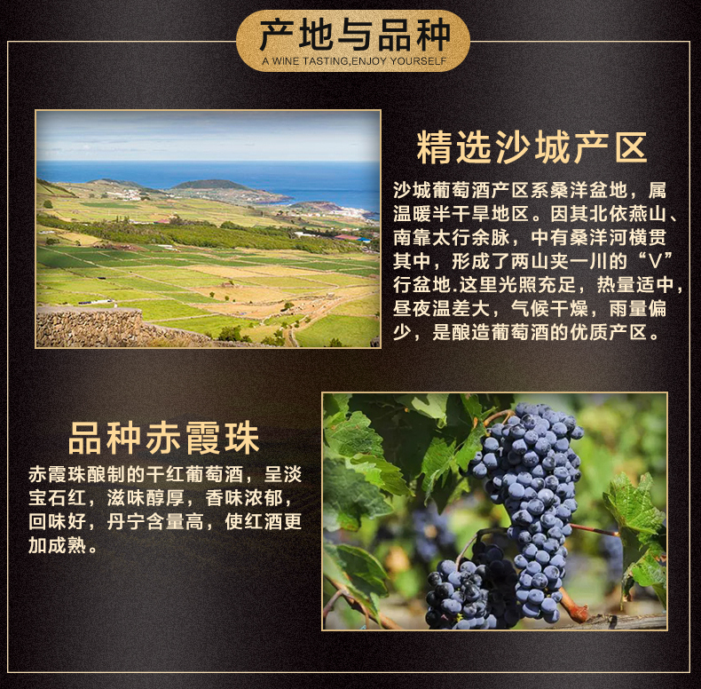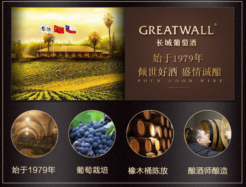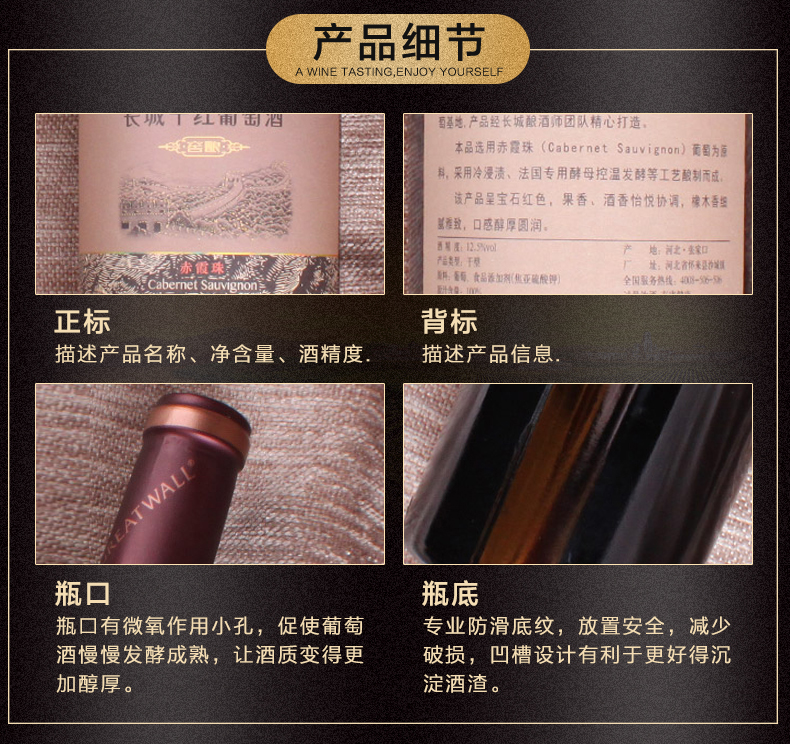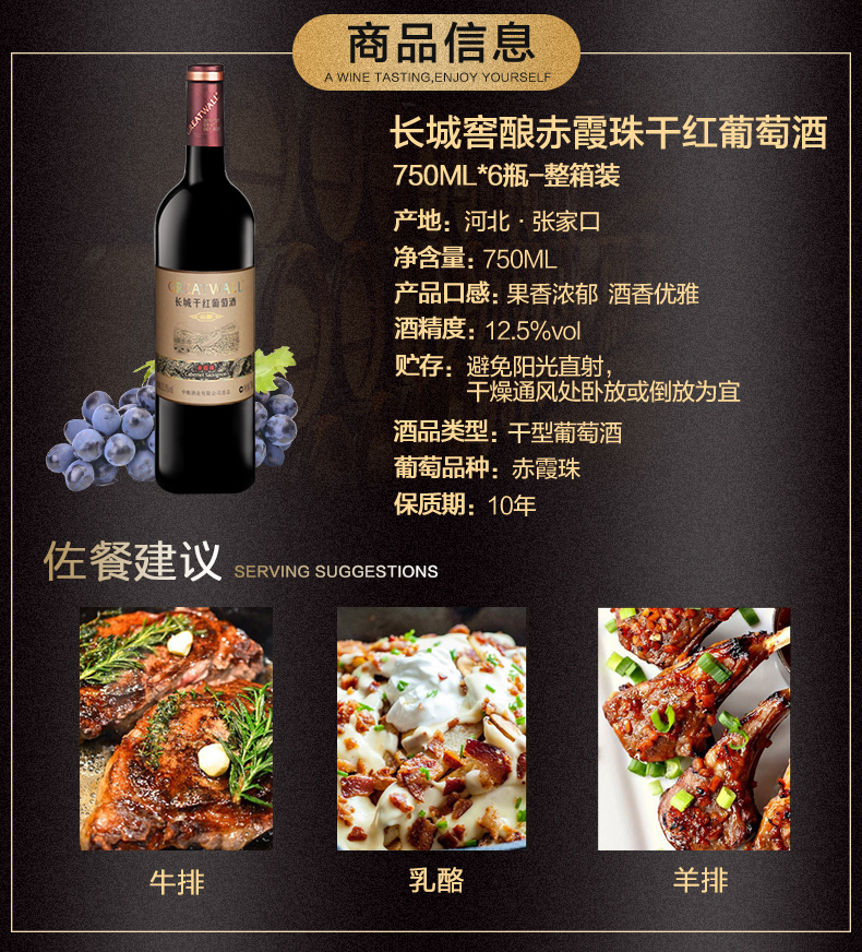 这款长城干红葡萄酒的产地是河北张家口,位于精选沙城产区,葡萄的品种选择赤霞珠,酿出的干红呈淡宝石红色,滋味醇厚,香味浓郁,回味好,丹宁含量高,经过橡木桶陈放窖酿,成酒果香浓郁,酒香优雅,别有风味。规格为750ml*6瓶。