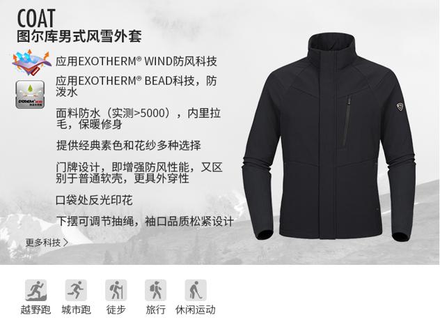 去年国庆假期小编在商城的诺诗兰专柜逛了一圈,价格几乎都在千元以上,最便宜的软壳打完8折也要将近上千块,这款诺诗兰软壳是19年款,面料分别采用EXOTHERM®️WIND防风科技和EXOTHERM®️BEAD防泼水科技,面料防水实测大于5000,能做到很好的防风、防水效果。