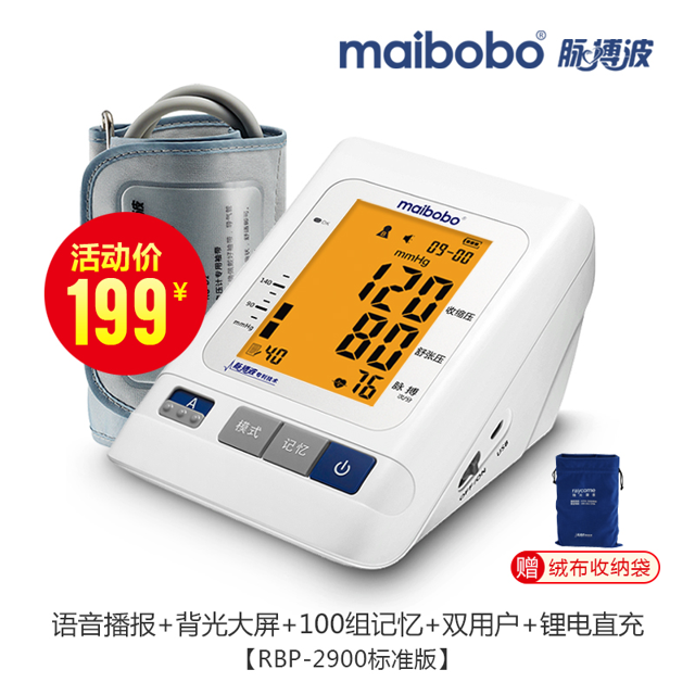 天猫maibobo旗舰店199元,可领130元优惠券,实付69元到手,第1款此价,还有蓝牙和远程款可选,蓝牙和GPRS款就是在标准版的基础上能连接蓝牙,上传数据到手机APP,GPRS版则是远程跨地区传输数据,比如家里老人测量,儿女异地可以接收到测量数据;血压计准确度是一样的。