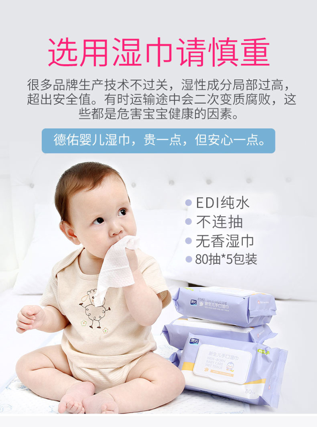 这款婴儿湿纸巾是无酒精、无香料、无荧光剂、无漂白剂、无苯甲醇等有害物质,是交叉铺网,具有抗拉扯性,不起毛,基本不变形。规格是80抽*5包。