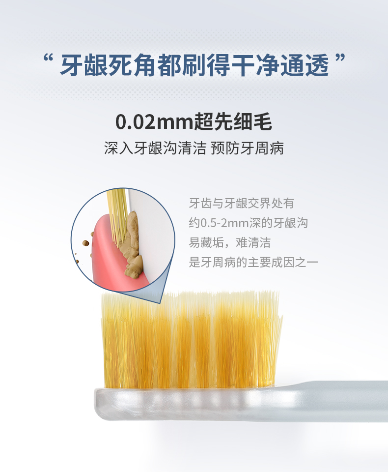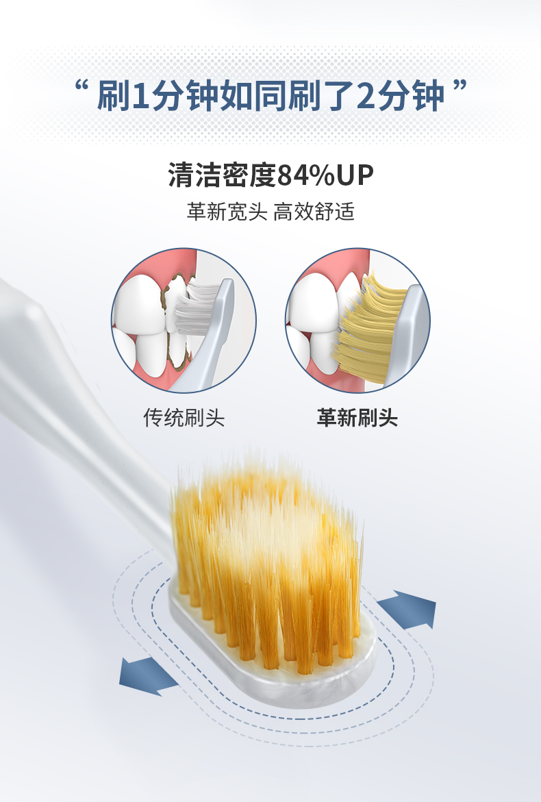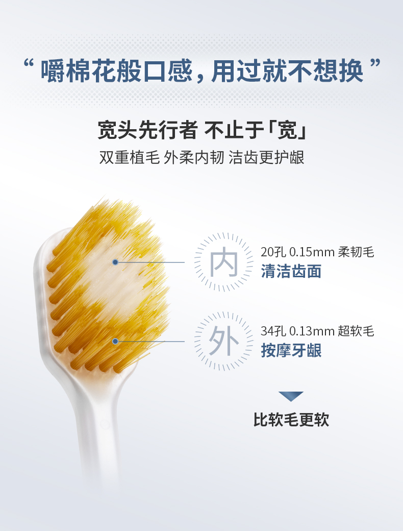 这款牙刷大宽头设计,毛孔数是普通刷头的2倍,能大面积的覆盖上下牙齿和牙龈,日本东丽定制刷毛,丝径20微米,双层不同柔软度、平尖两种的刷毛设计,柔与力兼施,清洁与按摩兼备,呵护娇嫩牙龈。选用铜片以15°固定刷毛,提高刷头强度和耐腐蚀性,干净又耐用。