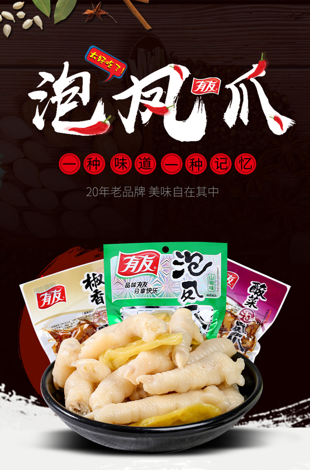 有友山椒凤爪,极具重庆地区民间特色,选用上等肉鸡爪,个头均匀,色泽诱人,肉筋饱满,先煮制、后泡制而成,酸辣够劲、好吃吃不停,甄选优质香辛料与小米椒,鲜嫩入味,鸡肉的鲜香与泡椒的爽脆相结合,既好吃又开胃。
