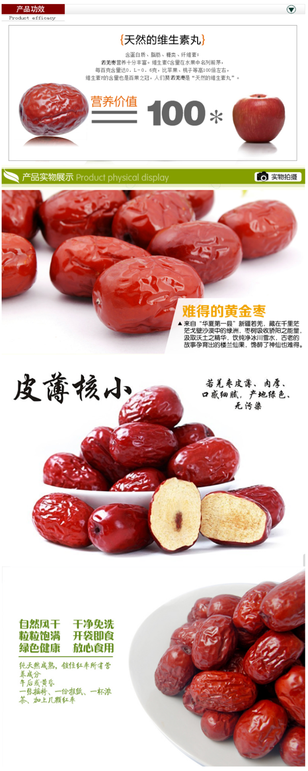 这款新疆免洗原生态若羌枣,产自“华夏第一县”新疆若羌,灰枣是吊干成熟,自然晾晒,枣子大小均匀,果肉饱满,几乎没有残次果和坏果。不添加甜味剂、防腐剂和色素。没有经过糖水浸泡,糖分≈64%,甜度刚刚好,没有经过人为熏硫保鲜,口感自然香甜。