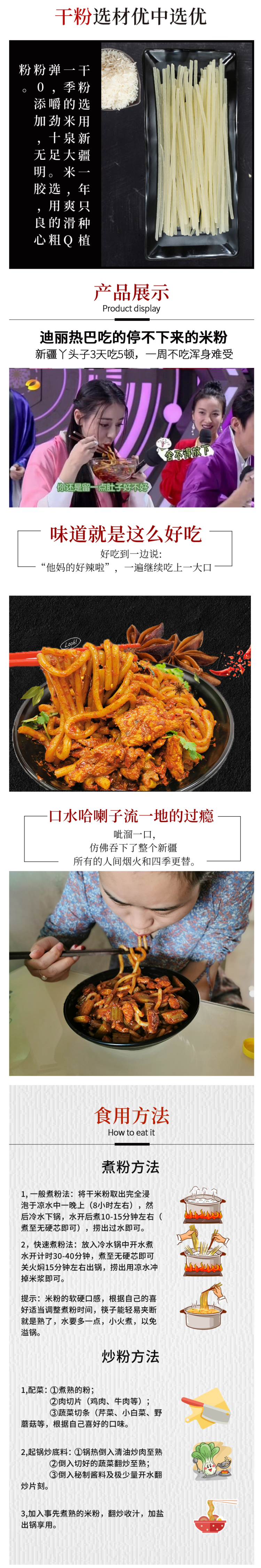 新疆炒米粉是一道新疆本地的名小吃。炒米粉使用的米粉比较粗有嚼劲,味道可以有微辣、中辣、爆辣,汤汁颜色浓郁。规格是单袋净重500g,米粉300g+酱料200g。