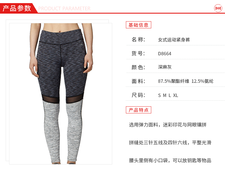采用87.5%聚酯纤维+12.5%氨纶弹的弹力面料,还有迷彩印花与网眼镶嵌,拼缝处是四针六线设计,不会有凸起摩擦皮肤。腰头里侧有小口袋,可以放小物件。
