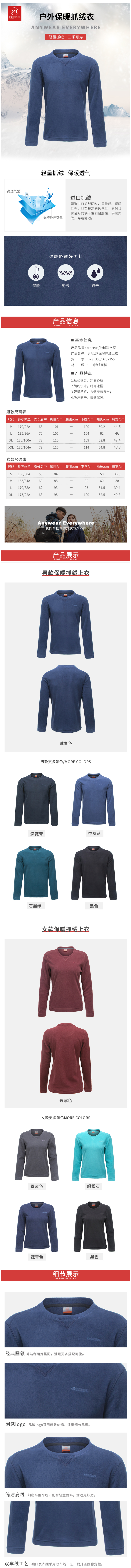 在款式和细节上,男合身/女修身版型,袖口和下摆采用双车线工艺,不易开线,无论是直接单穿或者作为中间保暖层都没问题。