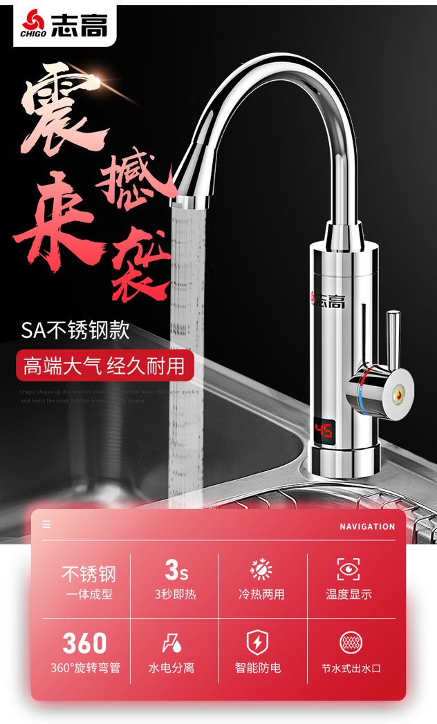 电热水龙头是专为无法正常供热的厨房/洗手间设计的,是厨房洗菜、洗碗、清洁,卫生间洗手、洗脸、洗头、洗衣等热水方便使用的最佳选择。它解决了家庭生活及公众场所对热水的日常需求,使你的家庭365天24小时方便的使用到热水。