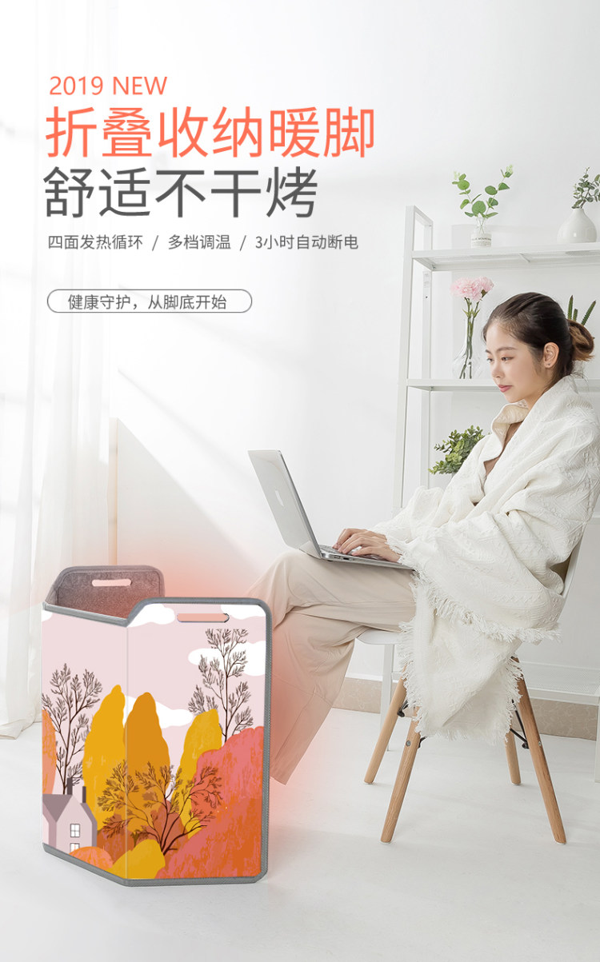 人性化保护3小时自动断电,180W小功率,节能环保宿舍、办公室都能用,三档温度调节,最高可达65度-45度,和热水浴的感觉差不多了,具备45°倾倒断电安全防护,可折叠收纳不占地。