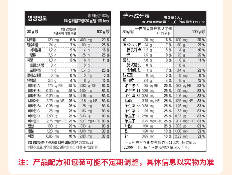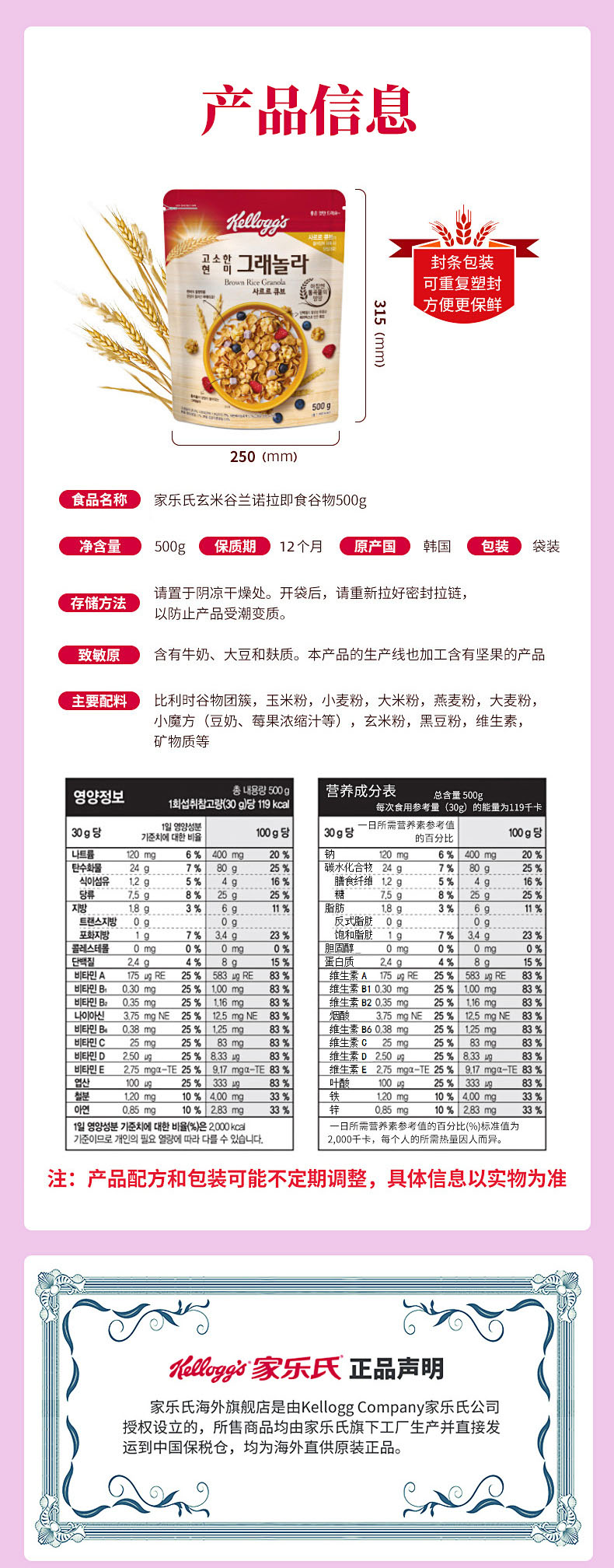 精选韩国玄米由黑豆粉精焙而成的五谷麦片,搭配比利时CLUSTER谷物团簇,将蜂蜜和谷物结合烤炉烘焙,还添加了冷冻干燥工艺制成的莓果豆奶冻干,保留原色原香。富含谷物清香,口感酥脆,营养多元化。