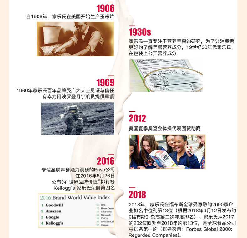 家乐氏公司(Kellogg's)是全球最大的谷物早餐制造商之一。成立于1906年, 总部设在美国密歇根州的Battle Creek。在18个国家建有加工厂,产品销往180多个国家和地区。《2018世界品牌500强》,家乐氏排名第302名。