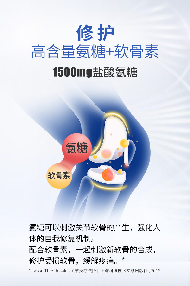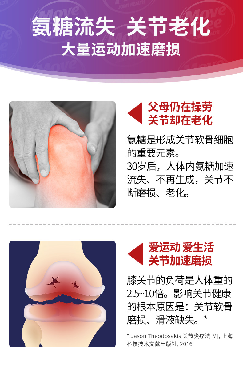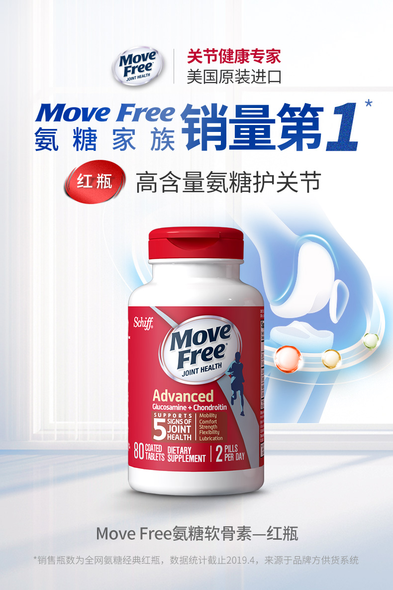 Move Free维骨力,是美国关节保健品市场上的第二大品牌,母品牌Schiff有近80年历史。Move Free最大的特点,是针对骨关节保健盲区“软骨”进行营养补充,核心营养素是“氨基葡萄糖”,也叫氨糖,美国有专门的医疗机构论证过氨糖的有效性。