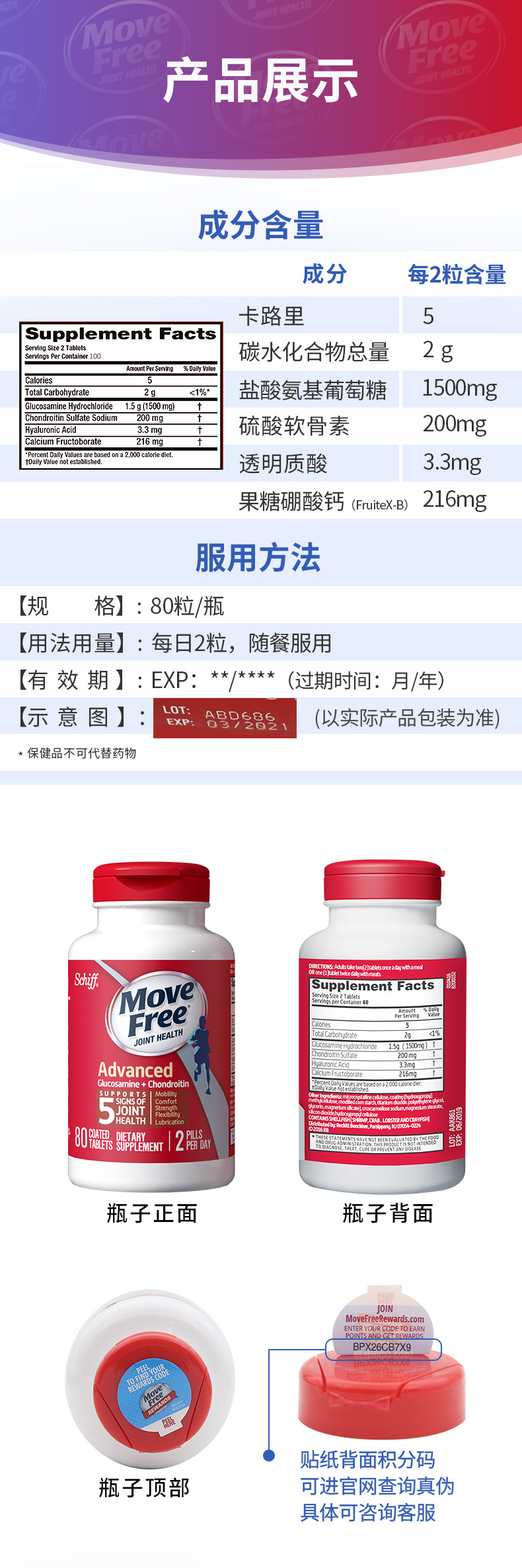 这款维骨力 氨基葡萄糖软骨素,是红盒,美国原产,作用是强化骨质骨骼,修补软骨组织,恢复关节活力,适用于关节轻度疼痛、运动损伤、劳动损伤的人,对于腰椎、手腕/关节、踝关节、膝关节、肘关节、颈椎均有效果;每日2粒,1次或多次随餐服用,规格是80粒/瓶。