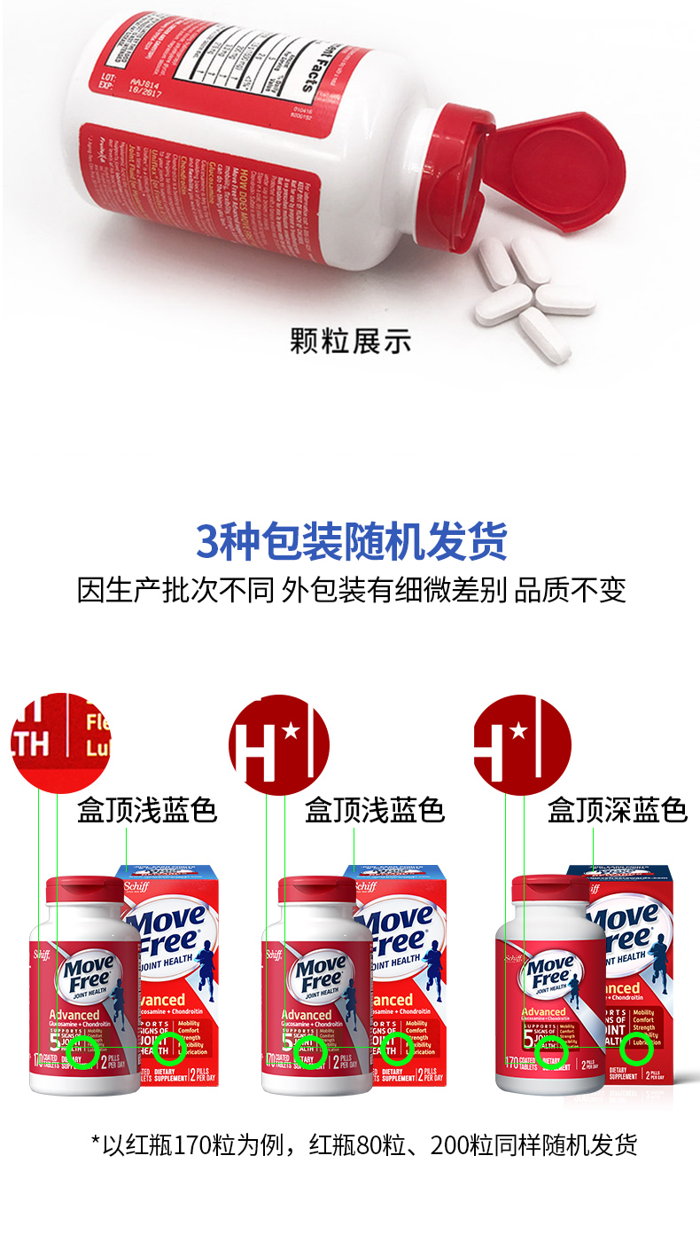 Move Free的热销产品,分为红盒、绿盒和蓝盒之分:初次服用首选红盒,关节疼的首选绿盒,70岁以上首选蓝盒。下面是详细对白: