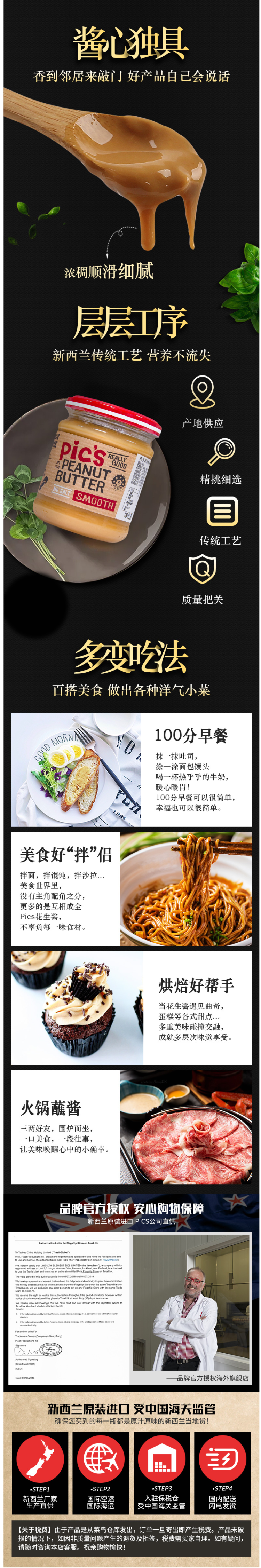 Pics的花生酱是新西兰国宝级的花生酱,也是全球最畅销的花生酱,在2014年新西兰最佳儿童食品提名奖1、2016年获得了世界星级美食大赛GREAT TASTE大奖,这个奖项堪称食品界的“奥斯卡”,含金量无可争议。