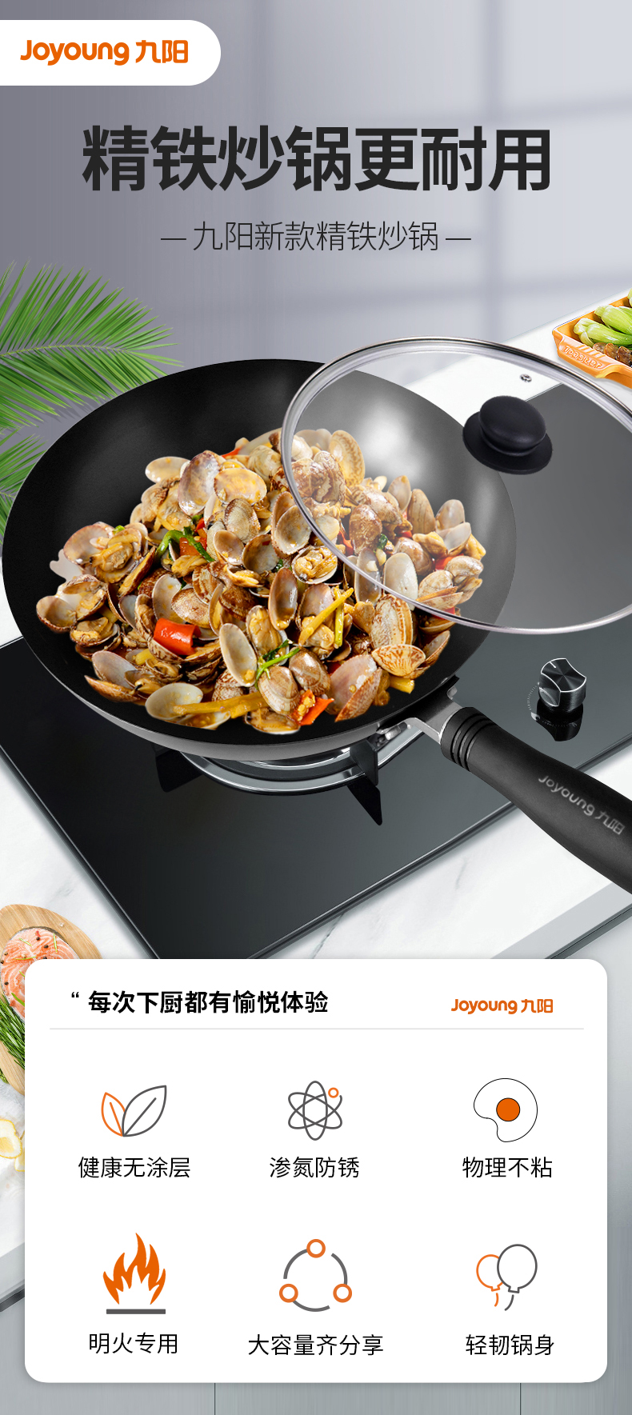 天猫九阳好易购专卖店99元,可领50元优惠券,实付49元到手,九阳精铁炒锅,全身氮化处理,锅体表面形成致密防锈层,增加锅体的耐磨性,表面硬度和抗锈能力,物理不粘健康无涂层,更安全更耐用,不生锈不易粘,健康少油烟,铁铲随便翻。