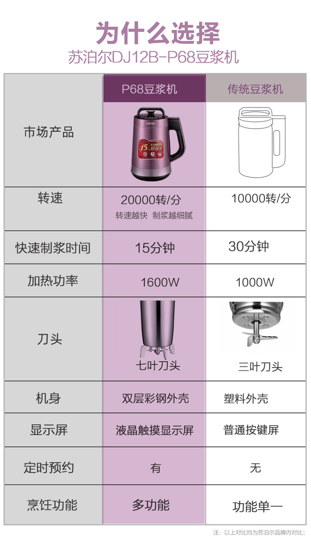 这款是苏泊尔商超同款的破壁豆浆机,从1万转速升级到了2万转速,刀头升级为了7叶刀头,加热功率高达1600W,快速制浆功能只需要15分钟就能喝到热乎乎的豆浆,而且苏泊尔是大品牌,全国联保,产品质量有保障。