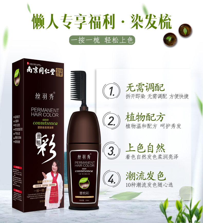 天猫楚颜化妆品专营店68元,可领50元优惠券,实付18元到手。11种颜色可选。南京同仁堂出品,专门做高端染发膏,梳发=染发,染完不伤发,一按一梳一洗,15分钟快速上色,温和不刺激,在家轻松搞定染发,健康安全。