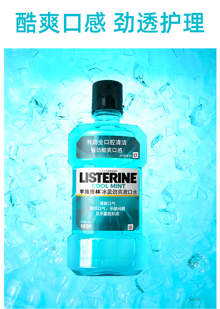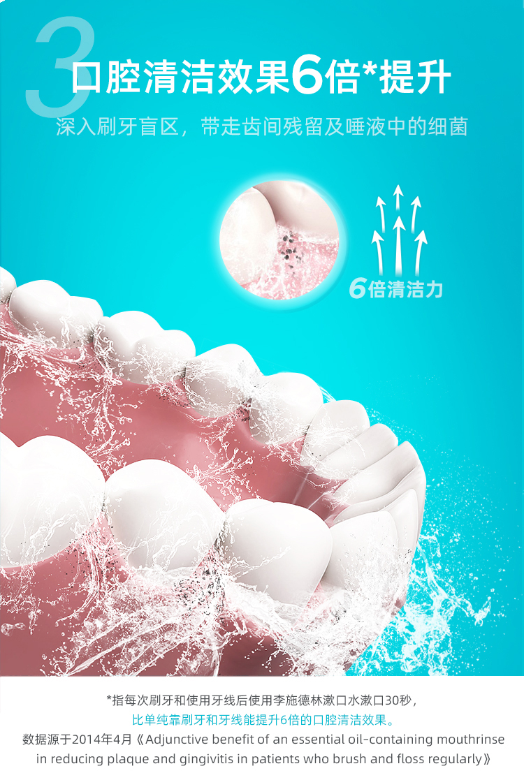 李施德林漱口水,可深入清洁口腔内部难刷部位,杀灭隐藏在牙缝间及刷牙后残留的细菌,比单靠刷牙更能有效减少牙垢膜及牙龈炎的形成。